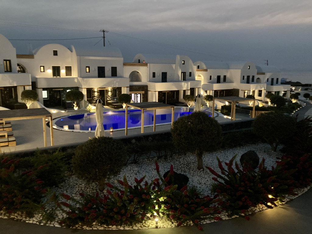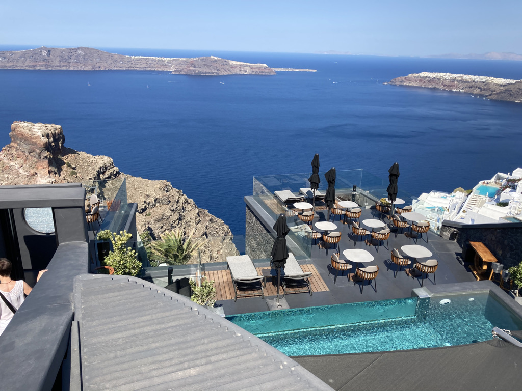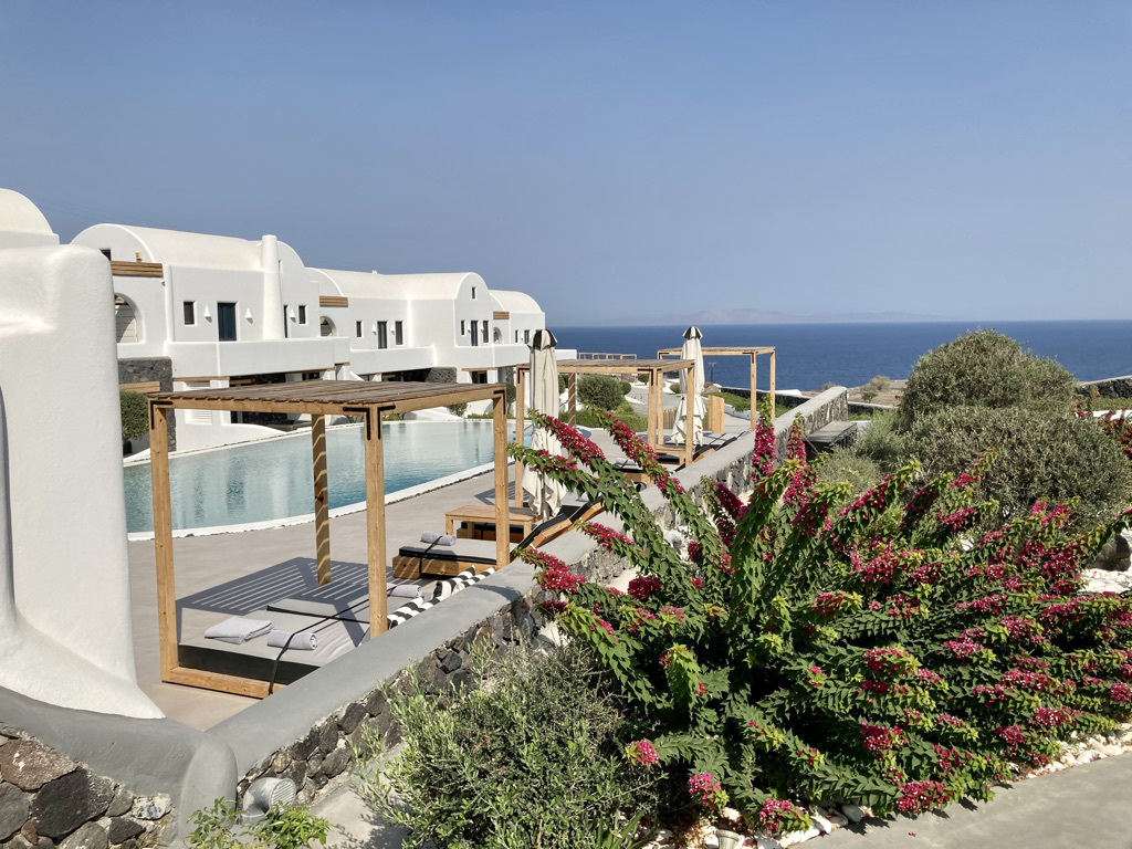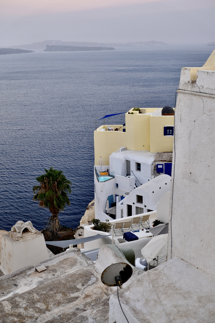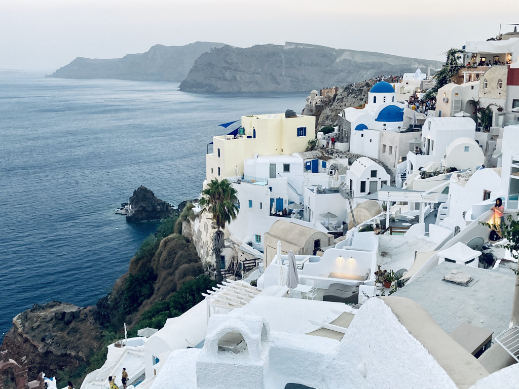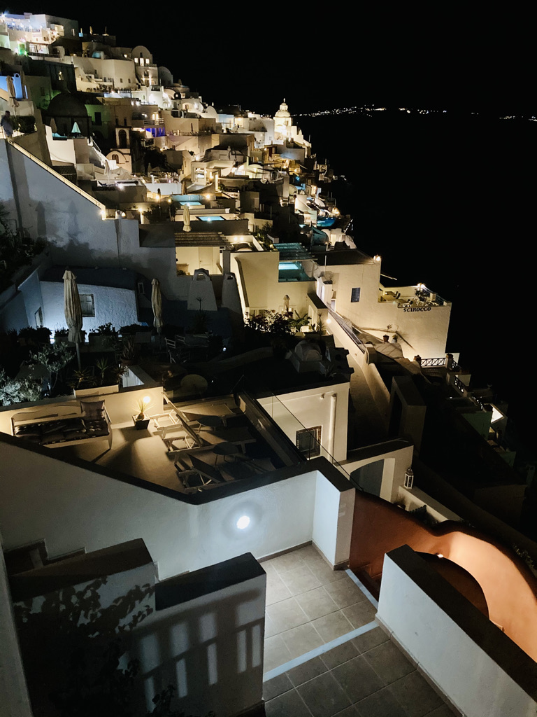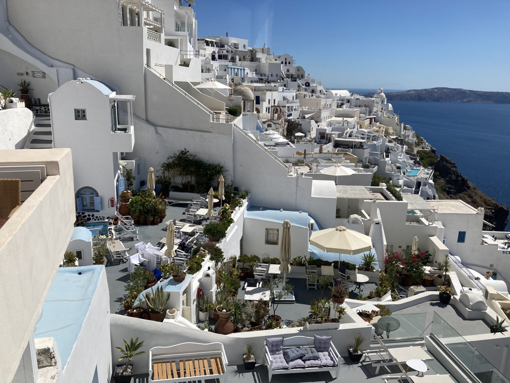 Wir fliegen immer gerne mit der Lufthansa, so auch dieses Mal. Der Flughafen auf Santorini ist winzig, aber gut ausgestattet und der von München aus bereits vorgebuchte Taxiservice zu unserem ersten Hotel in Oia klappt perfekt – und klimatisiert. Das ist wichtig, denn in diesen Wochen schmilzt Santorini, wie viele Mittelmeerorte in einer heftigen Hitzewelle dahin.