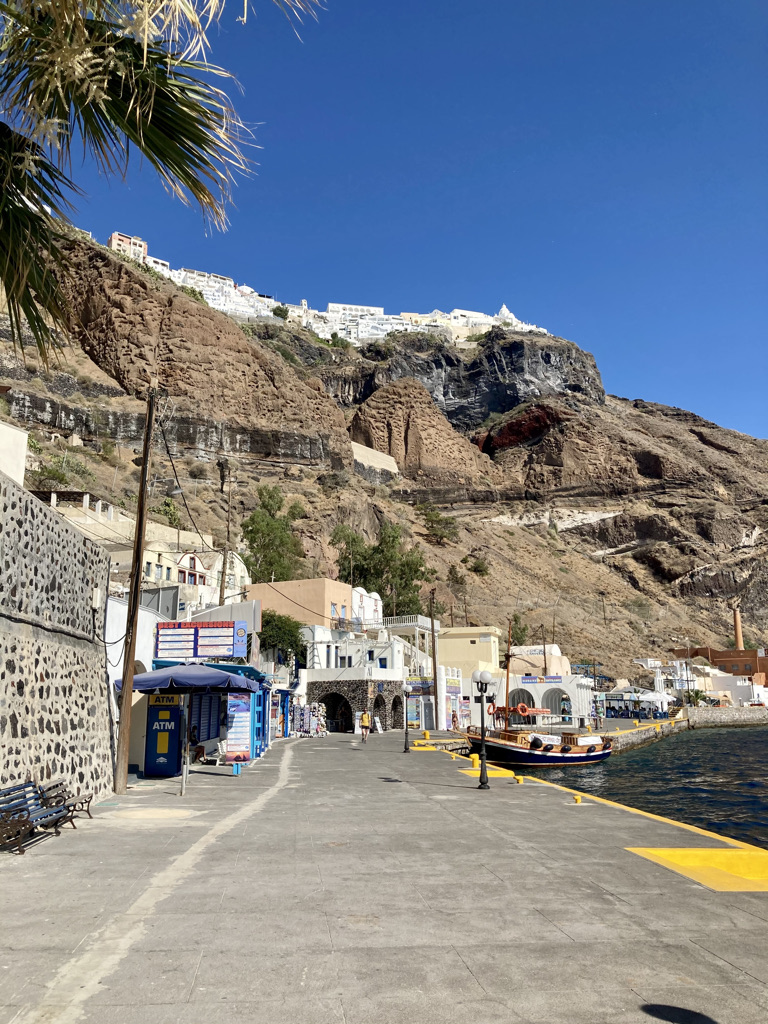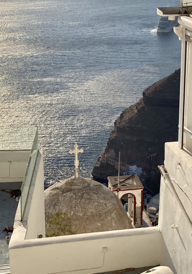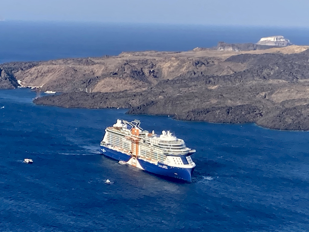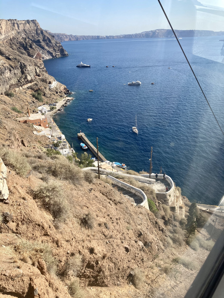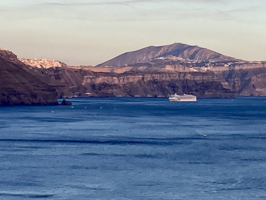 Am zweiten Tag in Fira fahren wir mit der Cable Car vom Dorfkern hinunter zum Old Port von Fira. Es gibt dort nicht sehr viel zu sehen, aber es ist ein netter Ausflug. Viele Passagiere der Kreuzfahrtschiffe landen hier an und fahren dann mit der Cable Car hinauf in die Stadt. Es gab übrigens keinen Tag ohne Kreuzfahrtschiff in der Bucht. Die Schiffe kommen früh morgens an und fahren abends wieder ab. Von morgens bis abends kann man den Pendelbetrieb zu und von den Schiffen beobachten, mit dem die Passagiere zu ihren Besichtigungstouren auf die Insel und wieder zurück auf die Schiffe kommen.