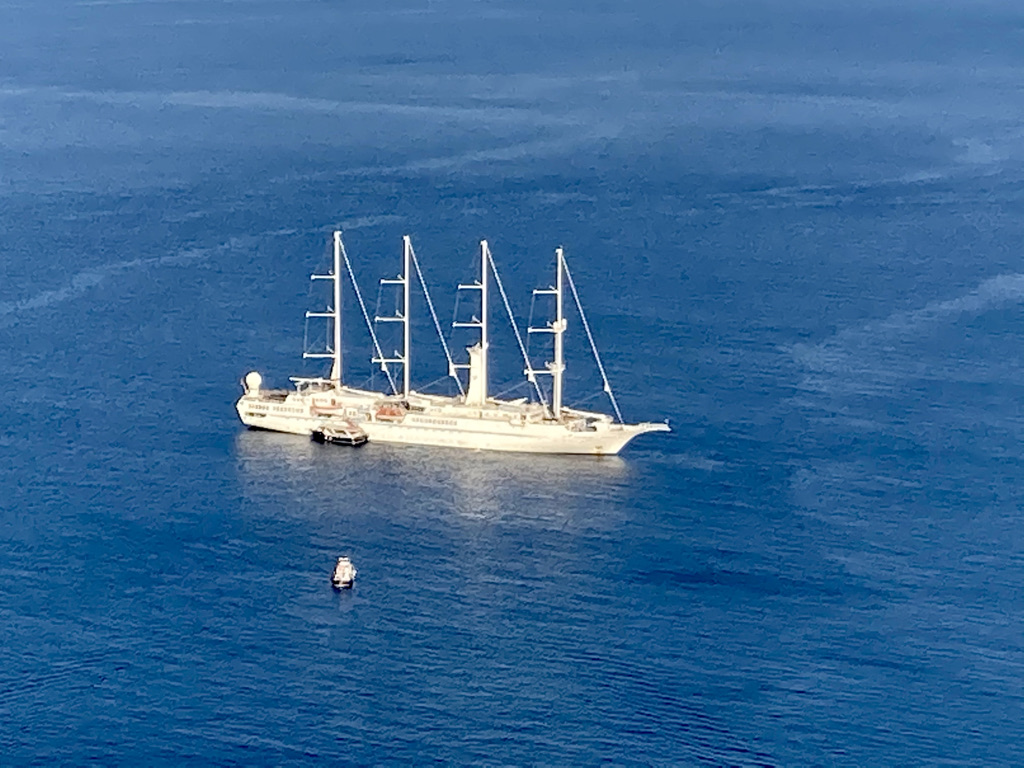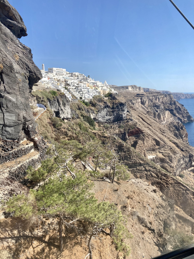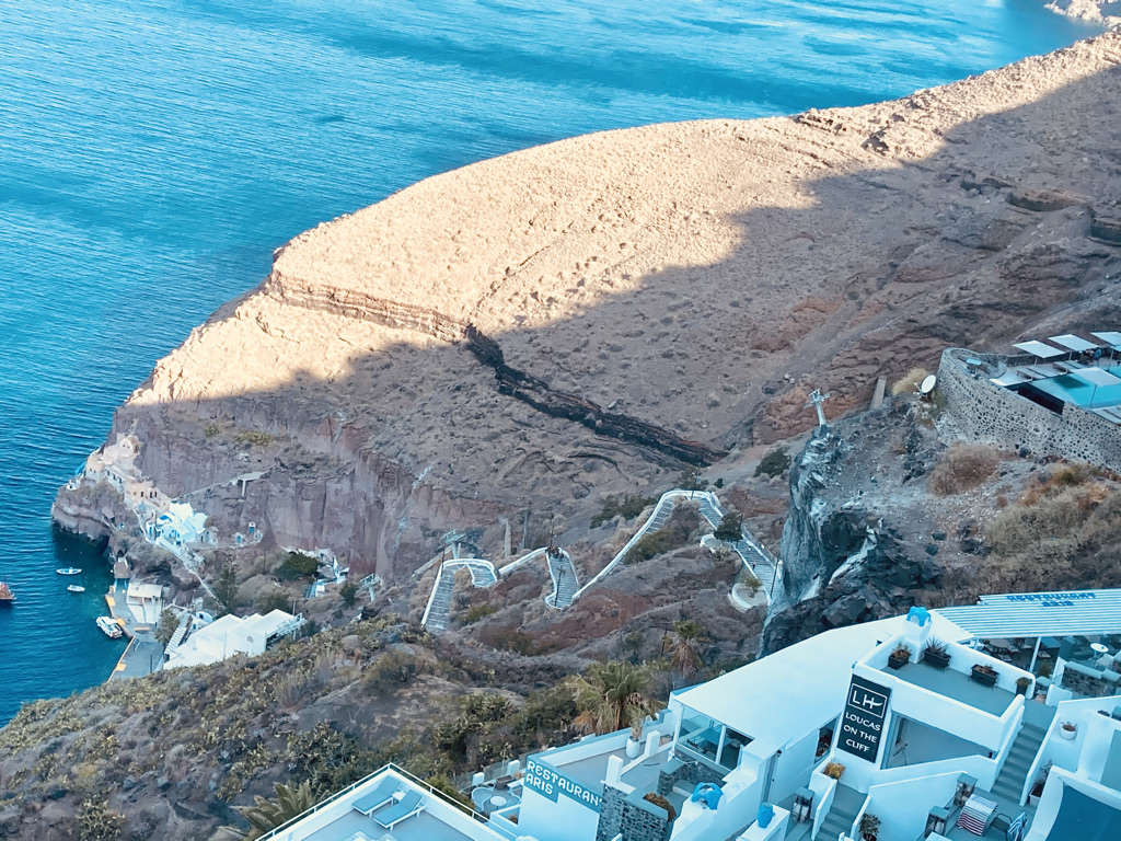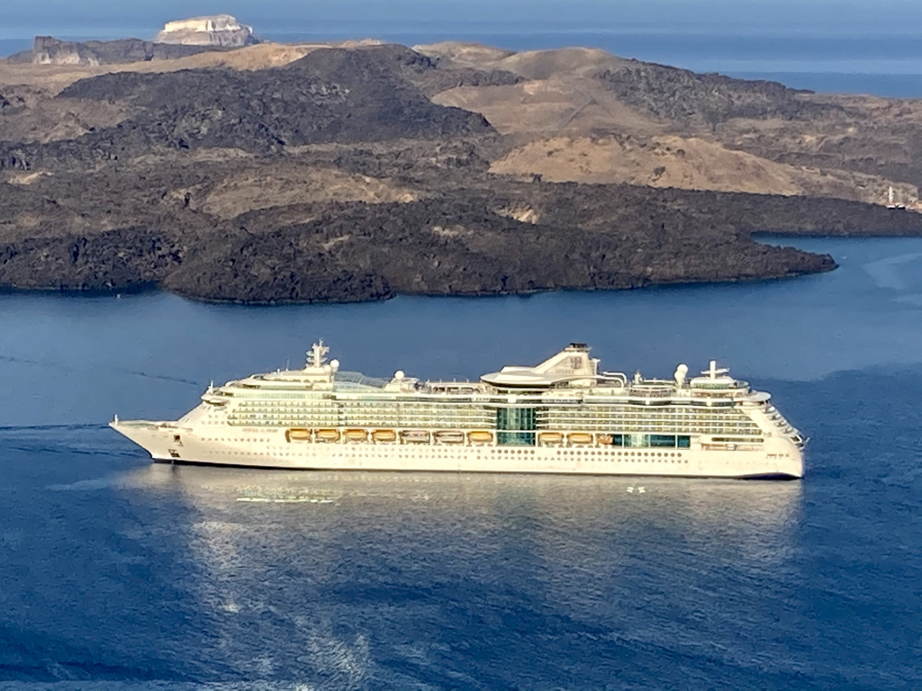 Am zweiten Tag in Fira fahren wir mit der Cable Car vom Dorfkern hinunter zum Old Port von Fira. Es gibt dort nicht sehr viel zu sehen, aber es ist ein netter Ausflug. Viele Passagiere der Kreuzfahrtschiffe landen hier an und fahren dann mit der Cable Car hinauf in die Stadt. Es gab übrigens keinen Tag ohne Kreuzfahrtschiff in der Bucht. Die Schiffe kommen früh morgens an und fahren abends wieder ab. Von morgens bis abends kann man den Pendelbetrieb zu und von den Schiffen beobachten, mit dem die Passagiere zu ihren Besichtigungstouren auf die Insel und wieder zurück auf die Schiffe kommen.