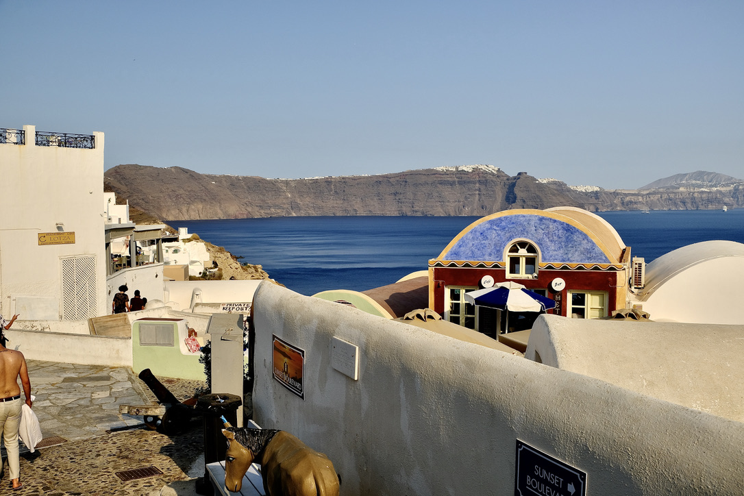 Nach der Fahrt vom Flughafen nach Oia kaum aus dem klimatisierten Taxi ausgestiegen, beginnen unsere Körper transpirierend mit der Aufgabe unsere Körpertemperaturen vor dem Hitze-Kollaps zu bewahren. (Das ist doch schön formuliert, nicht wahr? In klarem Deutsch: Es war heiß und wir haben geschwitzt, wie …-:)