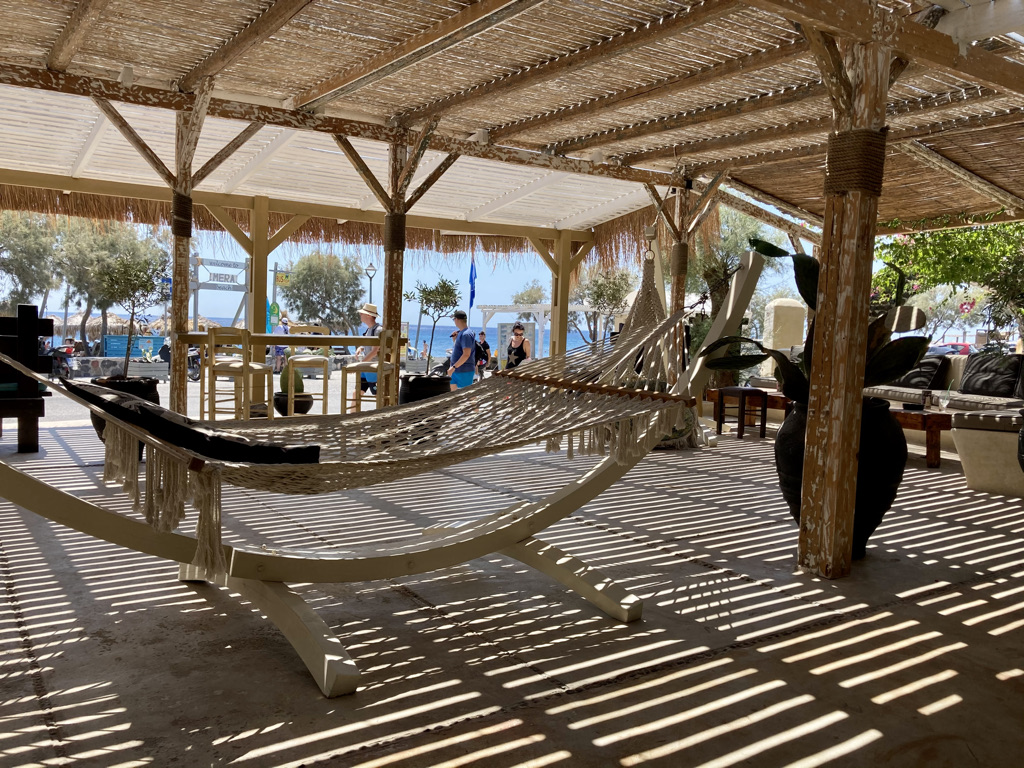 In Kamari Beach haben wir in der Amelia Taverna sehr gut gegessen und leider Jutta’s Biergarten nur im Vorbeifahren kurz gesehen. Zu mehr konnten wir uns Dank der unglaublichen Hitze beim besten Willen nicht aufraffen.