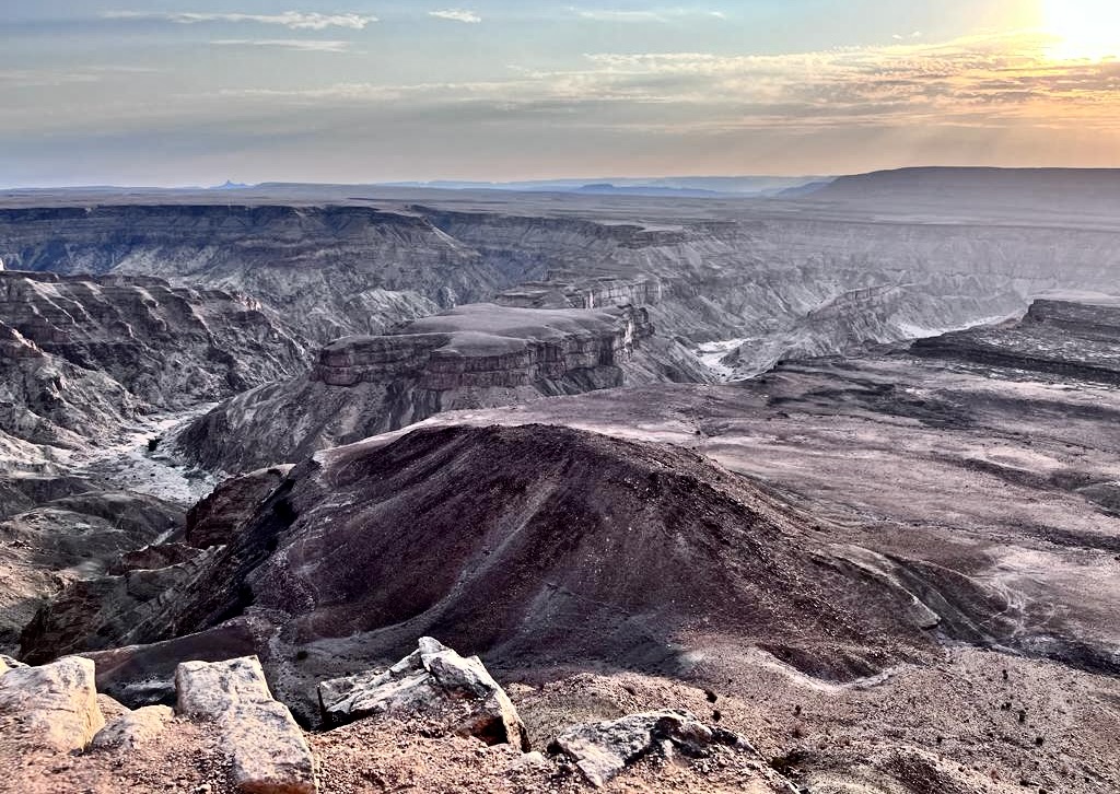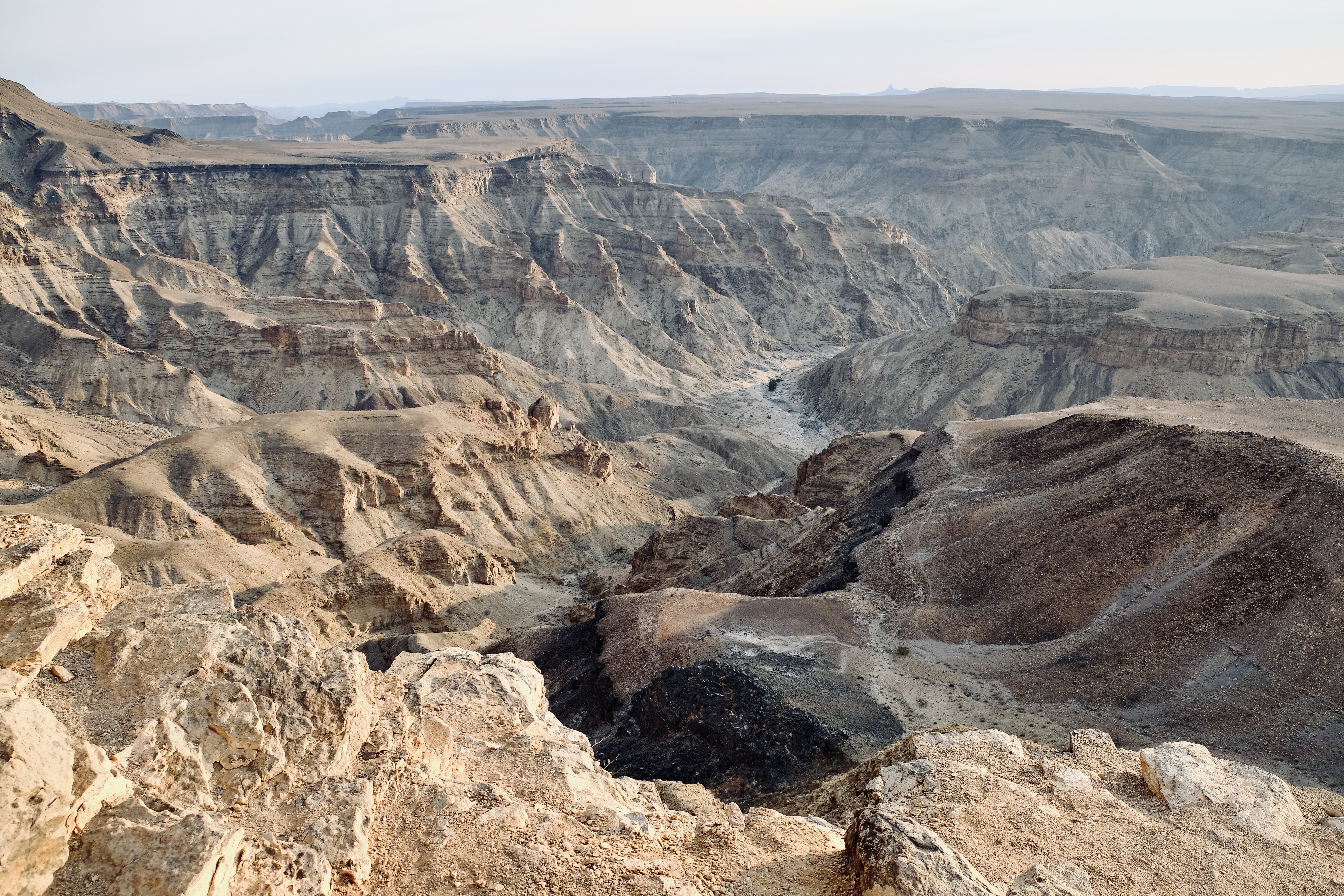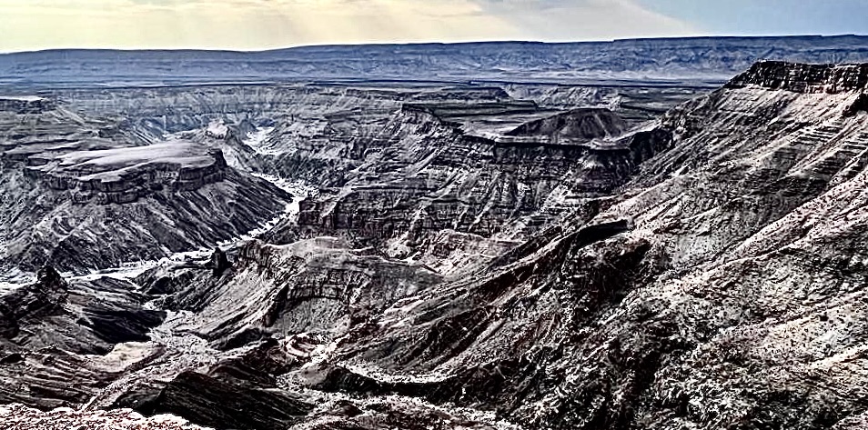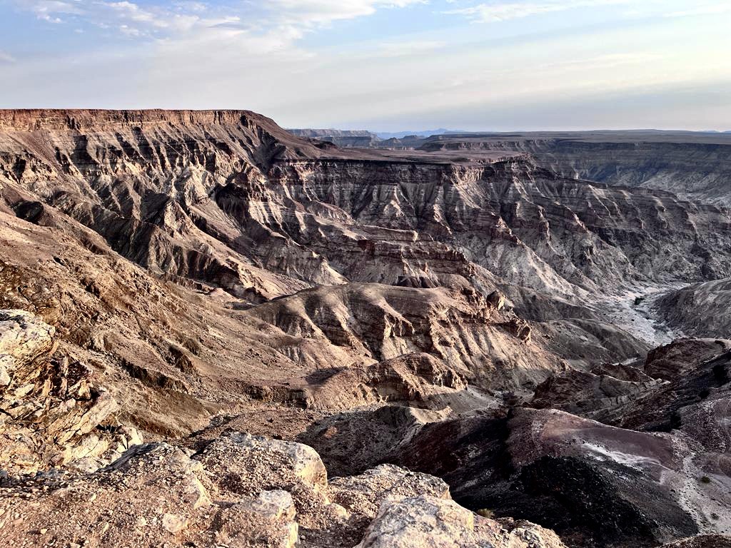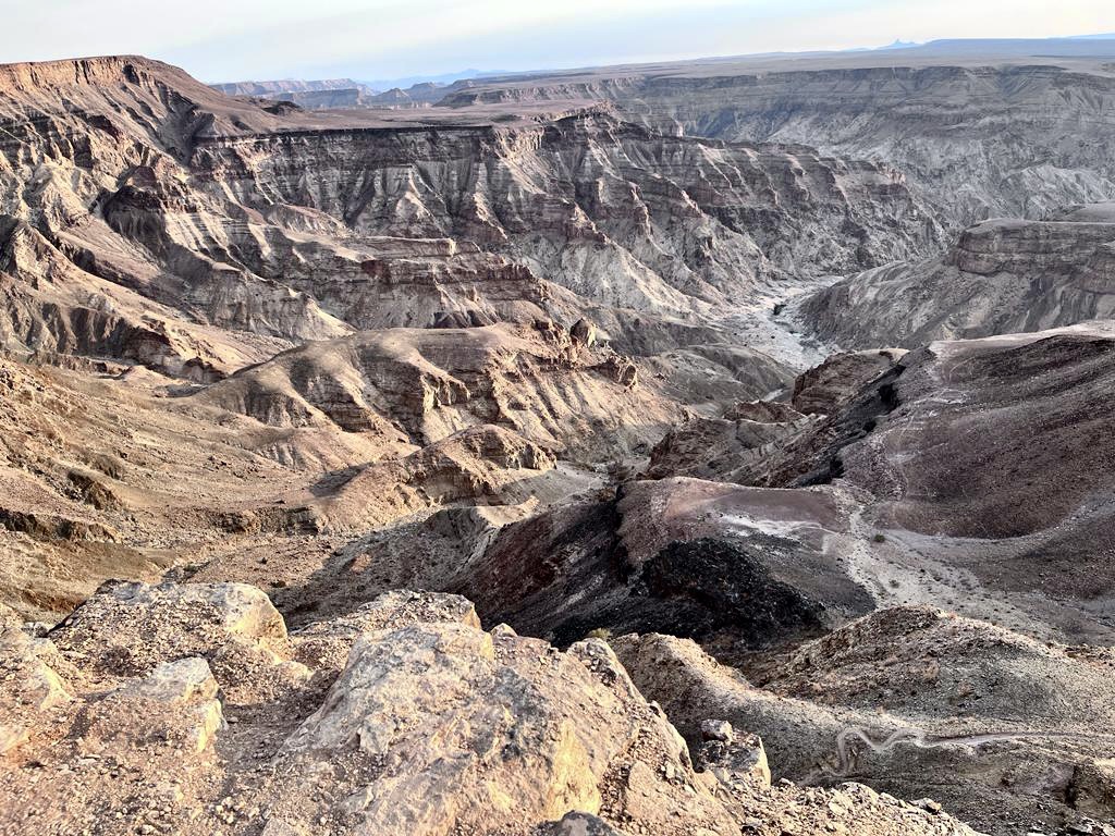 Die C12 führt ziemlich direkt nach Süden. Es geht an den Kleinen Karasbergen entlang. Links des Weges liegen die Karasberge, rechts steigen die Canyon Mountains auf. Der Fish River Canyon schlängelt sich am Ostrand der Canyon Mountains nach Süden und Südwesten. Er ist fast 160km lang teils bis zu 27 km breit und bis zu 550 m tief. Der Canyon ist in den letzten 500 Millionen Jahren entstanden. Ausgefräst vom Fish River, dem mit 800 km längsten Fluss Namibias, als sich das gesamte Gelände langsam um mehrere hundert Meter hob und der Fluss sich Meter für Meter wieder in seinem Bett nach unten arbeitete. Doch zunächst ist von ihm nichts zu sehen. Kein Fluss und kein Canyon. Wir fahren nur durch karge, leicht bergige und schotterige Landschaft.