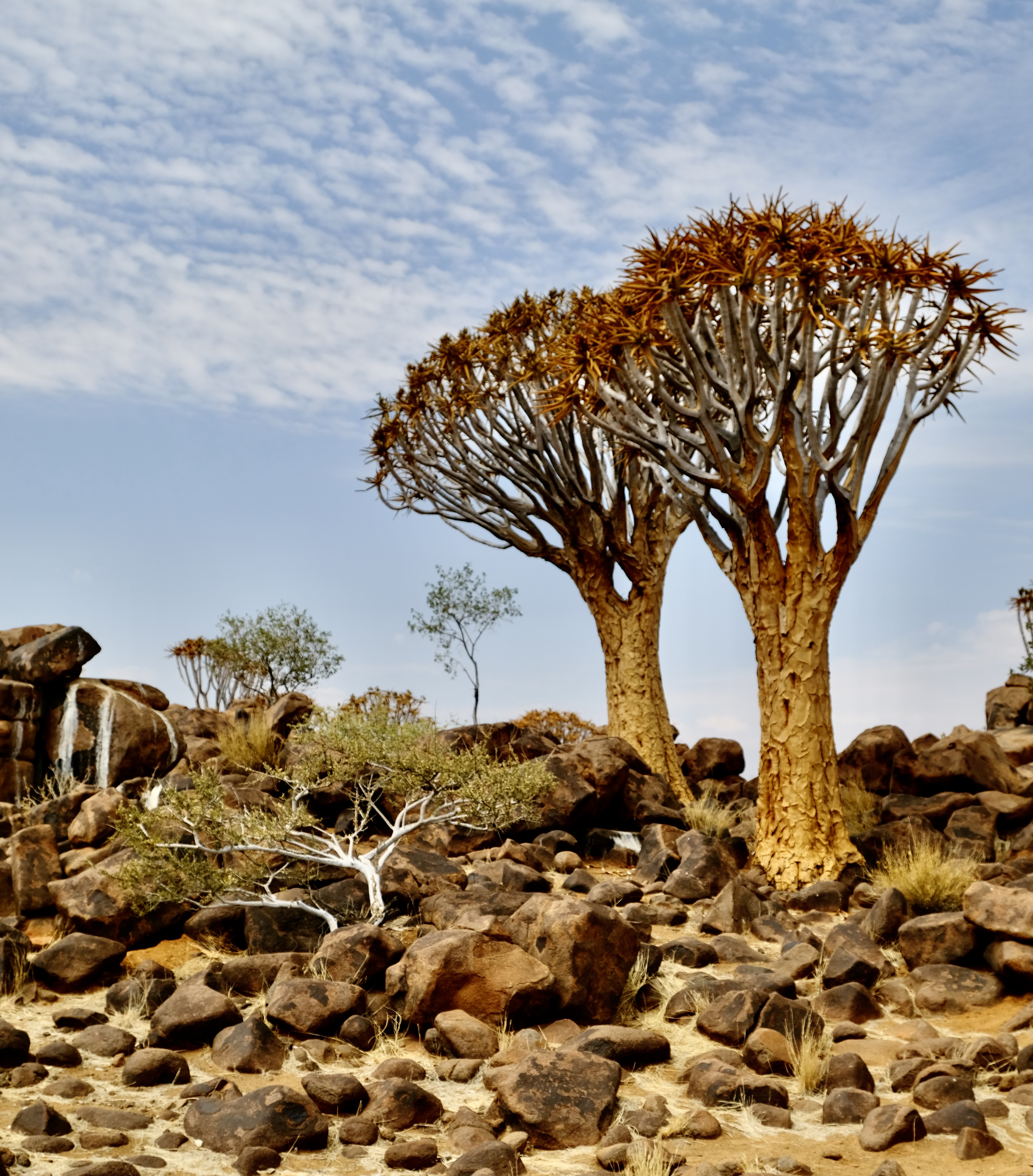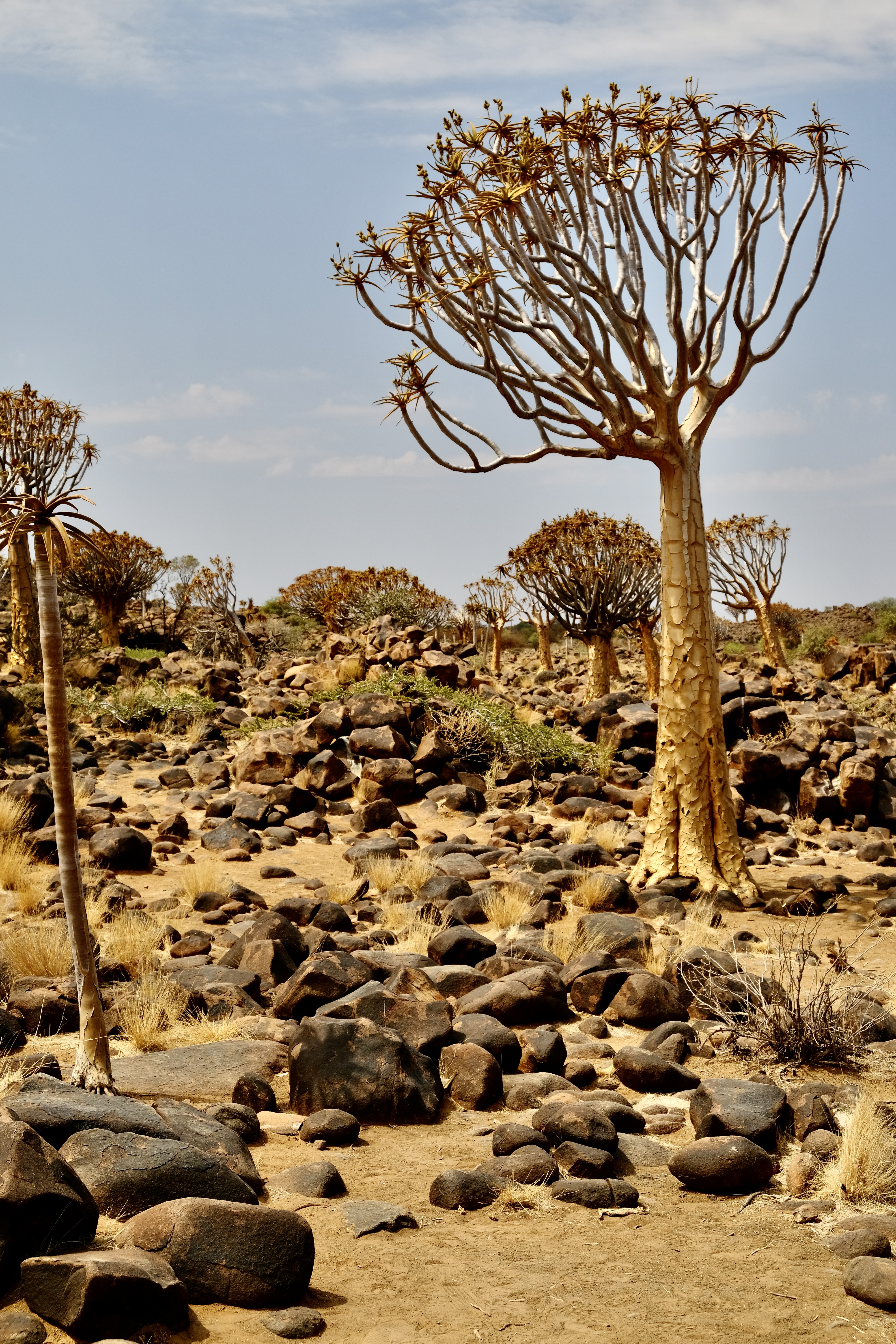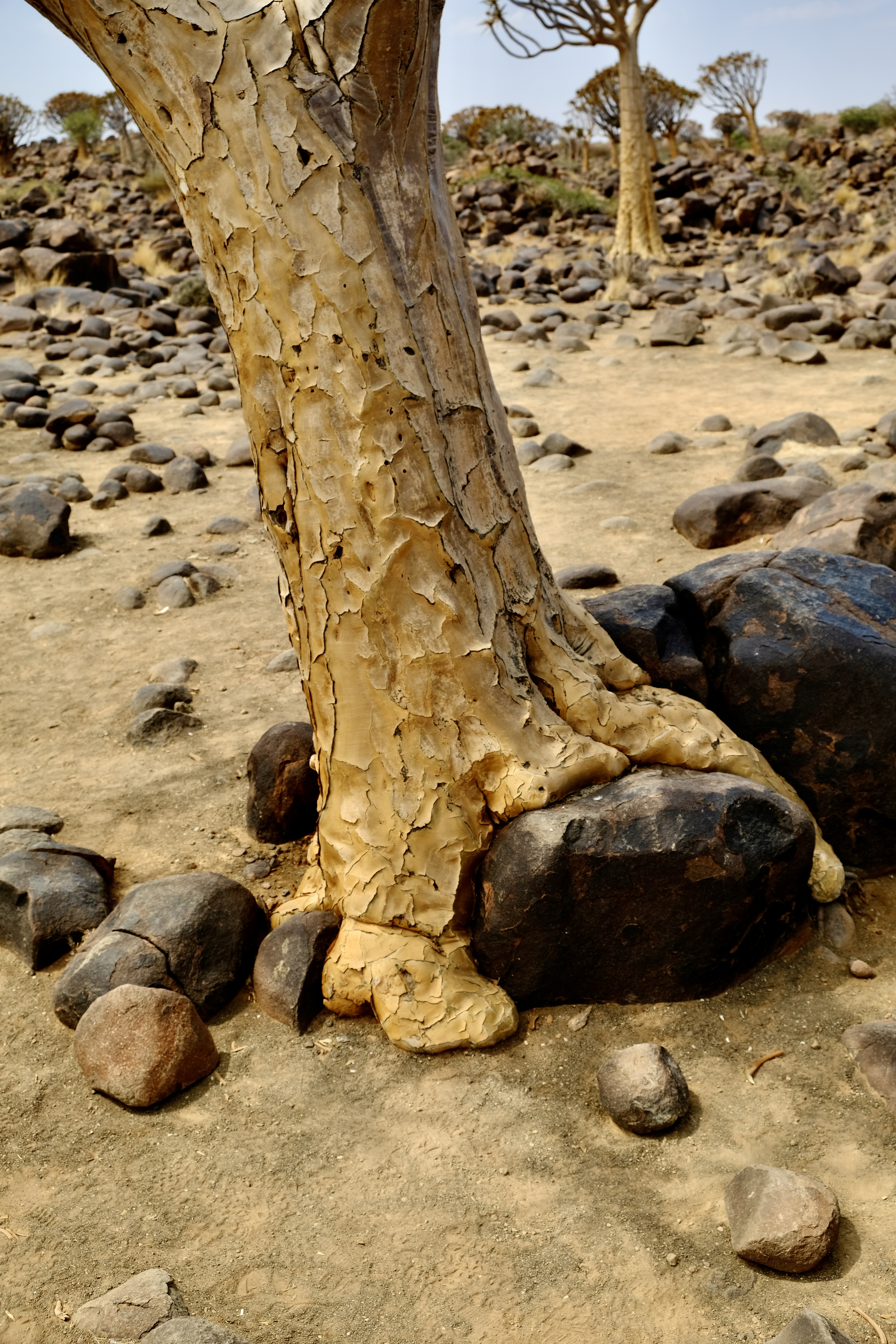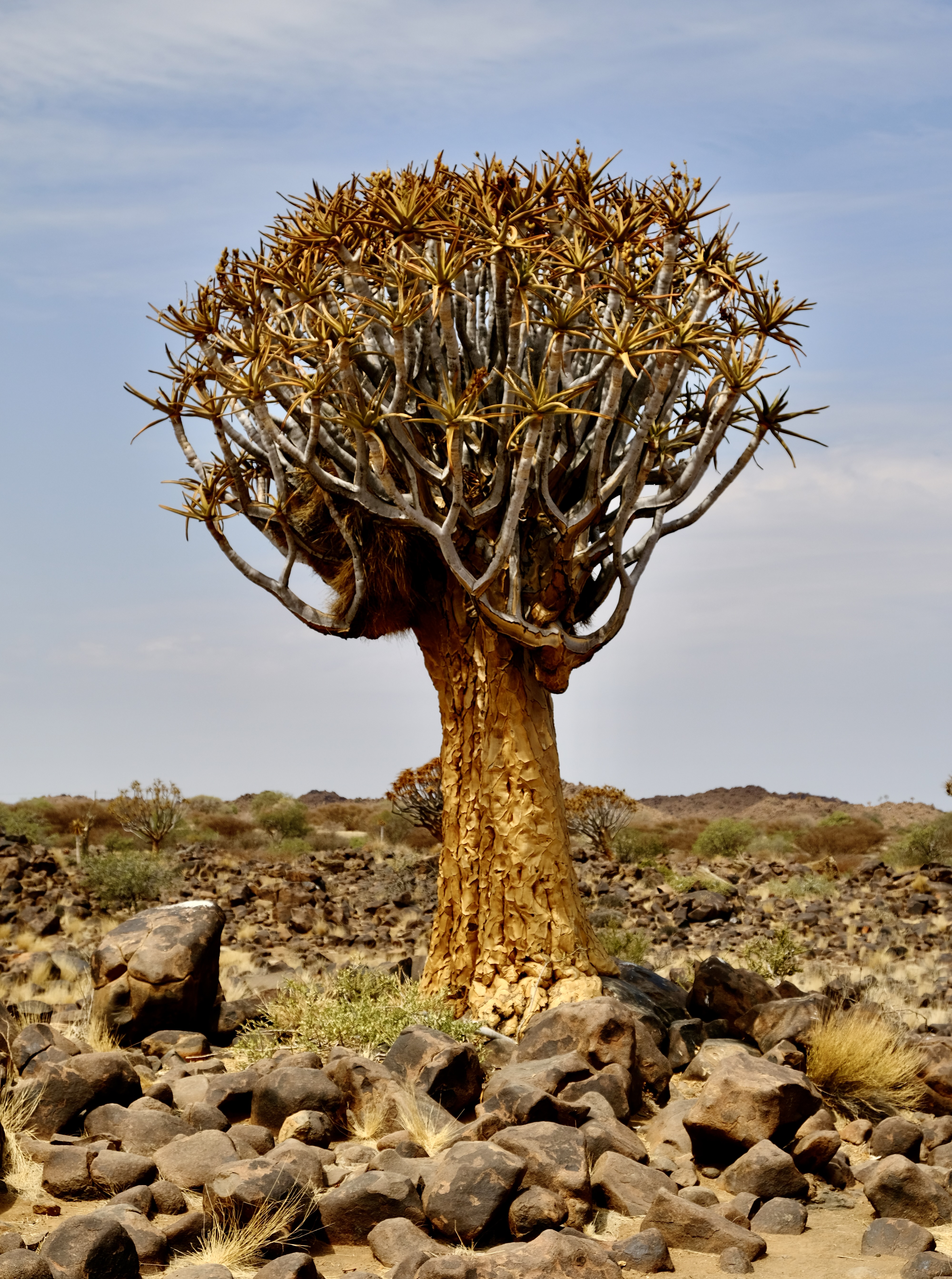 Kurz vor Keetmanshoop machen wir einen Abstecher in den Quivertree Park und sehen uns in brütender Hitze diese seltsamen Bäume an. Der Quivertree, oder Köcherbaum, ist vor allem in Namibia und Südafrika verbreitet und wächst dort in trockenen felsigen Regionen. Seinen Namen hat er bekommen, weil früher die Buschmänner aus seinen Zweigen Köcher für ihre Pfeile gefertigt haben.