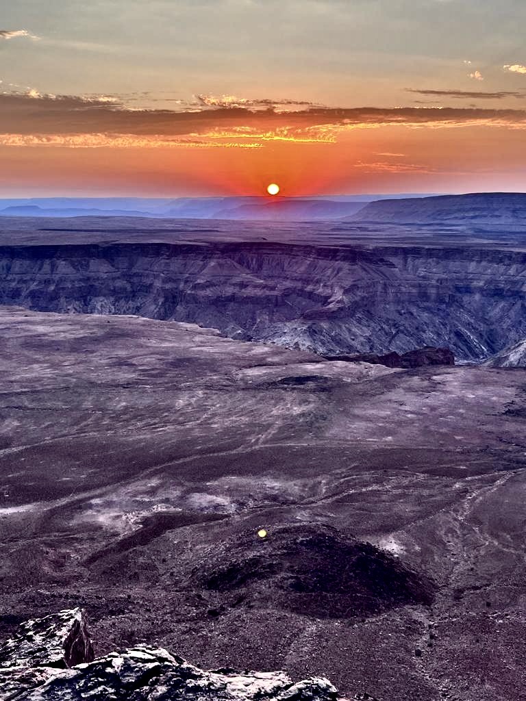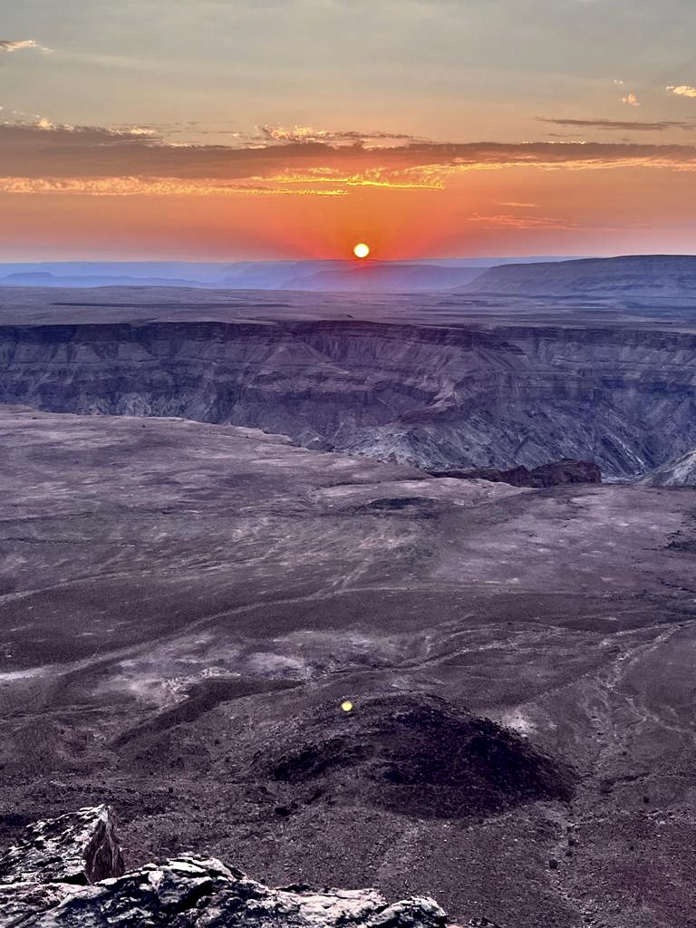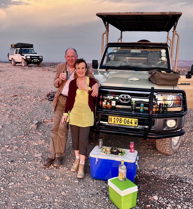 Zum Sundowner Drive fährt uns unser Ranger Simon mit seinem Toyota Landcruiser zum Fish River Canyon hinab. Und stösst mit uns mit einem „Gesundheit“ an! Er sagt, das ist hier der Trinkspruch.