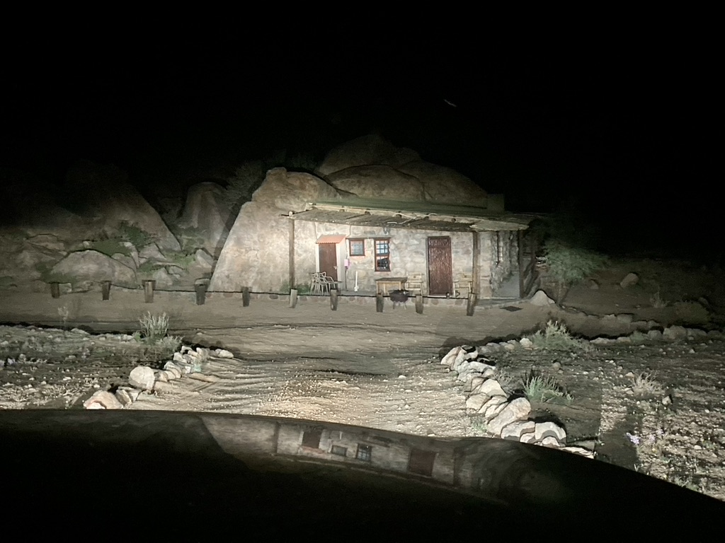 Spannender für uns ist allerdings unsere Unterkunft. Wir wohnen im „The Wall“, einer sensationellen Hütte, die an einem Felsen angebaut ist. Die paar Hütten um unsere herum, im Abstand von je rund 100 Metern nennt sich zusammen das Eagles Nest. Um vom Eingang des Geländes mit dem Haupthaus zum Eagles Nest zu kommen fährt man 7 km über Feldwege nach Süden in Richtung der Dünenausläufer der Namib. Weit und breit ist nichts. Besonders nachts ist das fantastisch. Kein fremdes Licht, kein fremdes Geräusch, keine anderen Menschen. Nur die Sterne am Himmel – und was für ein spektakulärer Himmel!