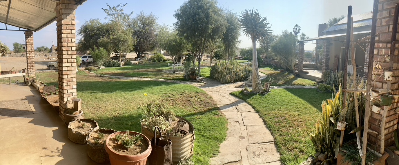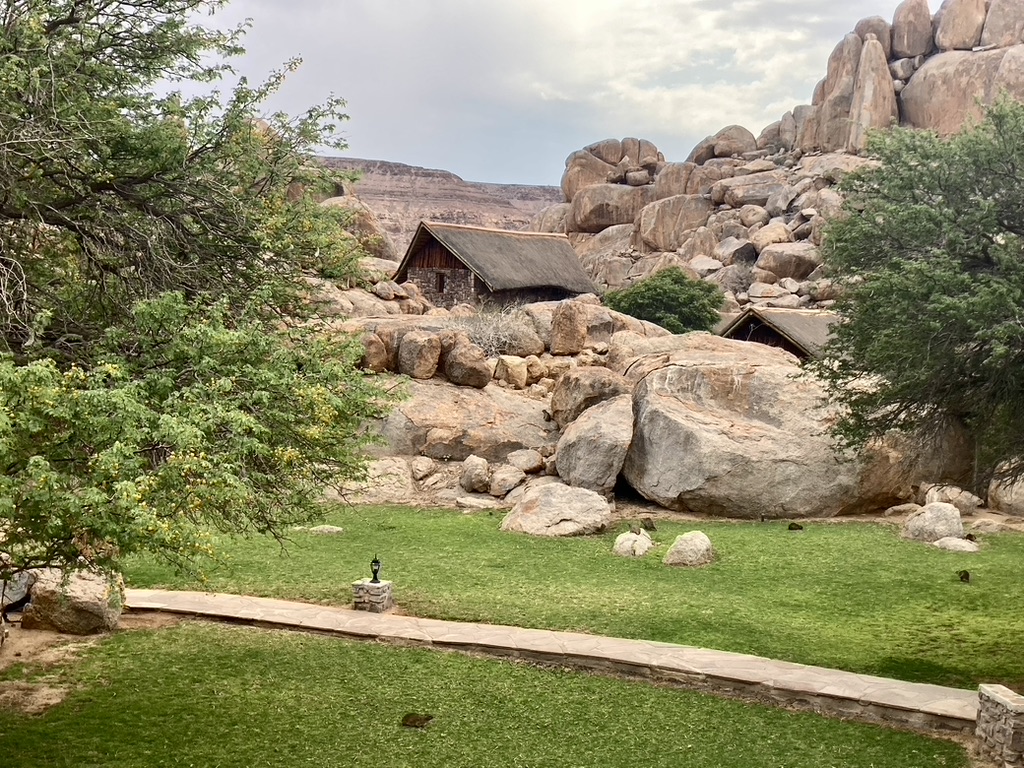 Die Fish River Canyon Lodge scheint wie eine kleine Oase in dieser staubtrockenen Landschaft. Ein tiefer Brunnen macht es möglich. 200 m tief wenn ich mich recht erinnere. Es gibt hier grünes Gras, viele Büsche und grüne Bäume und – man glaubt es kaum – auch einen Pool mit einem herrlichen Ausblick.