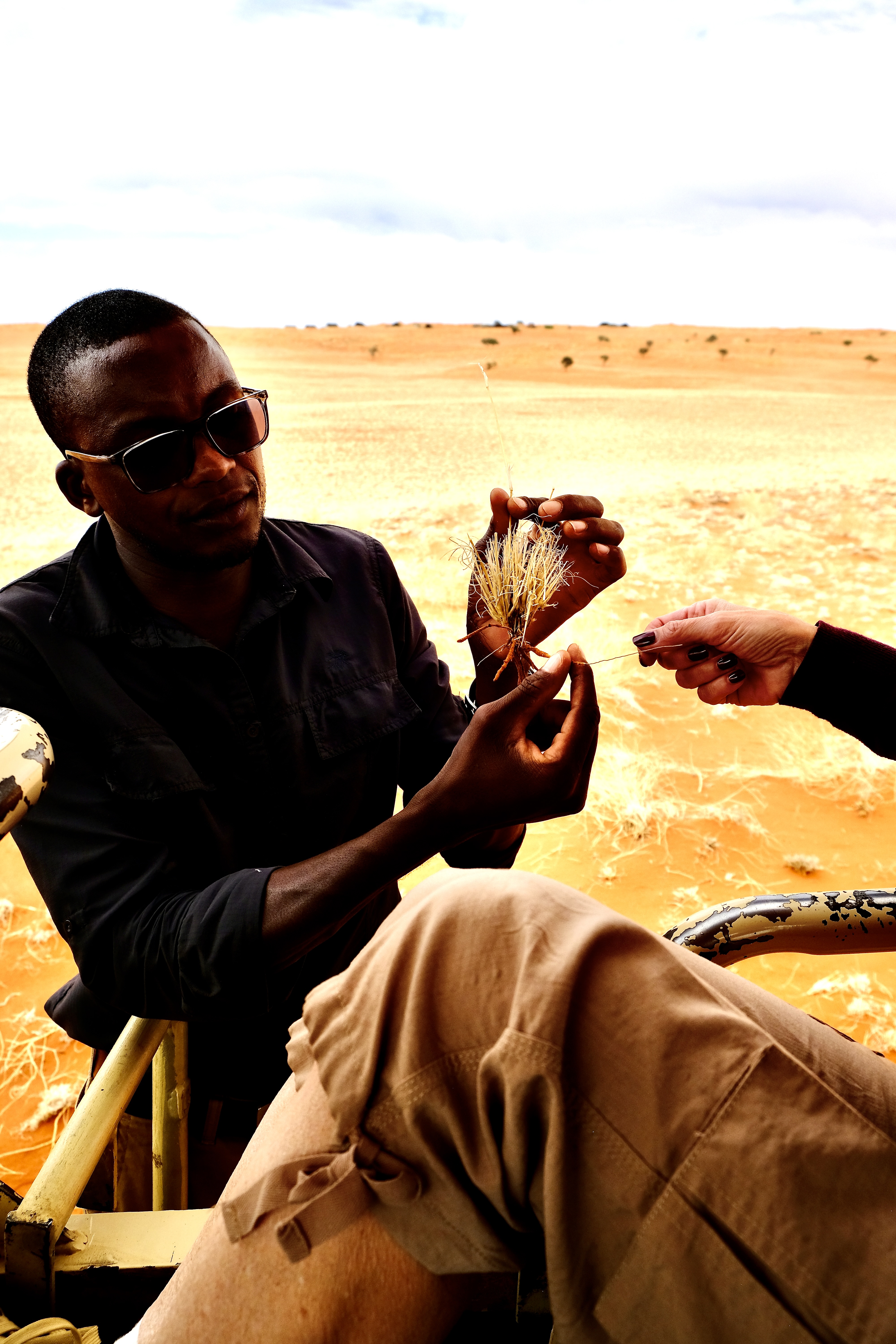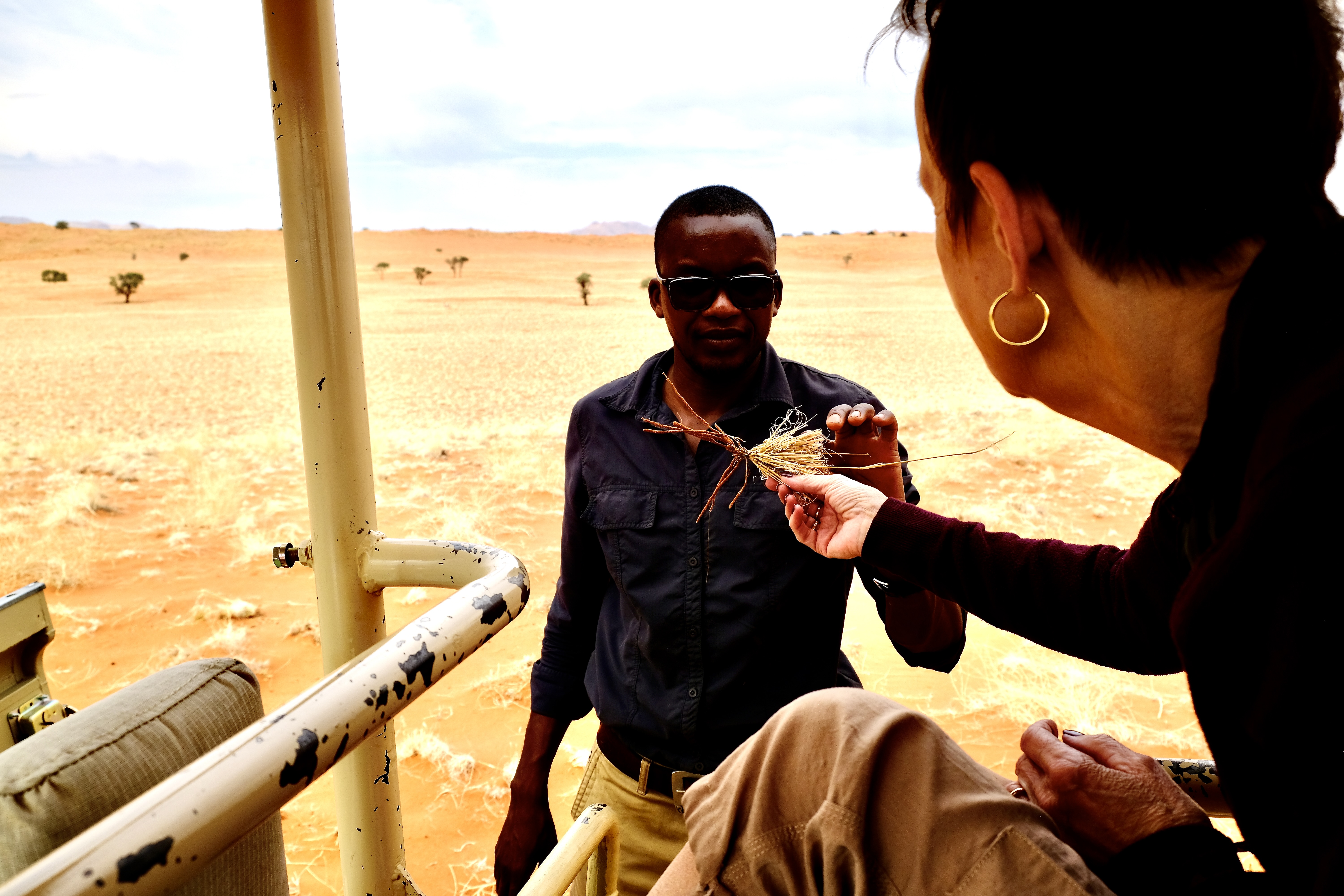 Ähnliche Überlebenskünstler gibt es hier in den überall wachsenden Buschman Gräsern. Das Buschman Gras kann bis zu 5 Jahre ohne Wasser überleben. Unter dem Sand sind die Wurzeln mit feinsten Fasern ausgestattet um auch noch den kleinsten Tropfen Wasser aufzunehmen. Wenn Tiere auf der Suche nach Feuchtigkeit das Gras bis zum Sand abfressen, treibt das Buschman Gras aus der Wurzel wieder neu aus.