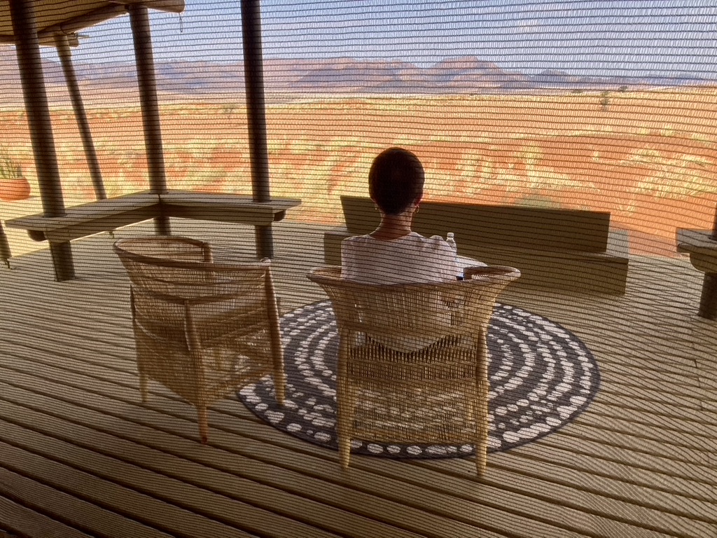 Für unser Frühstück haben wir uns einen großen Picknickkorb vom Haupthaus zusammenstellen lassen und es gab dazu einen beeindruckenden Blick aus ‚The Wall‘ hinaus auf die roten Dünen der Namib.