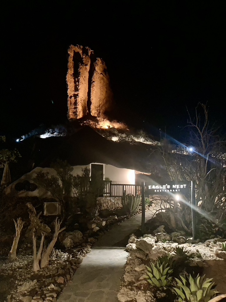 Zum Abendessen reservieren wir uns einen der wenigen Plätze im Restaurant auf der Spitze des Vingerklipps. Auf dem Eagles Nest. Sowohl der Aufstieg, als auch die Aussicht von oben sind wirklich fantastisch. Zum Abendessen gibt es Kudu und Wildschwein mit Gemüse.