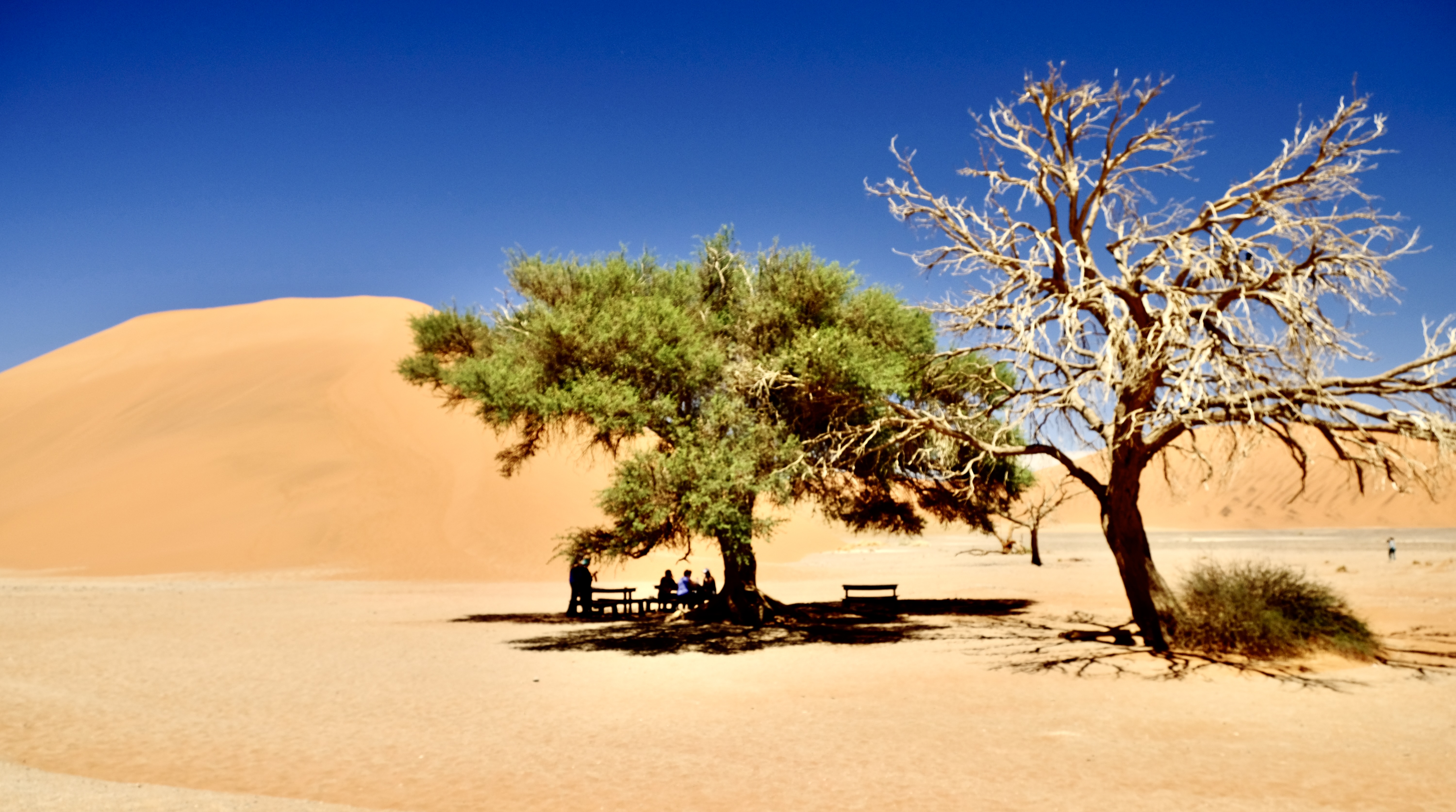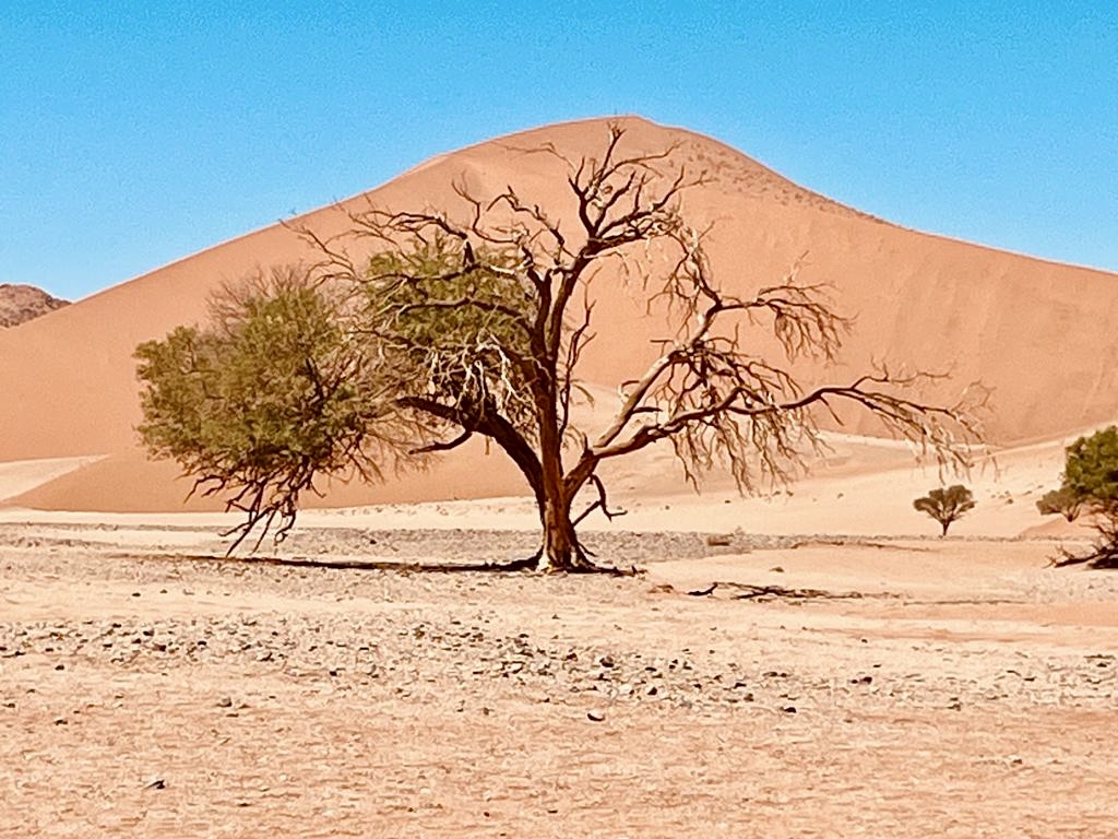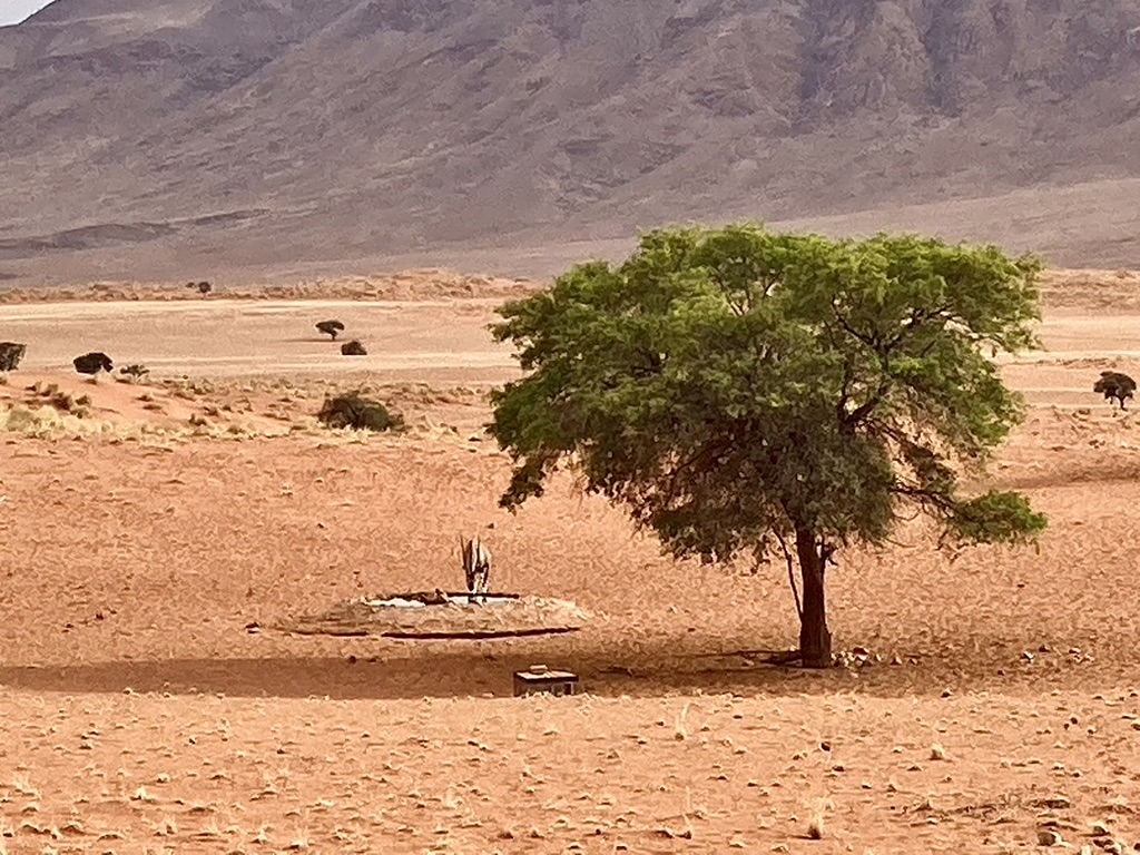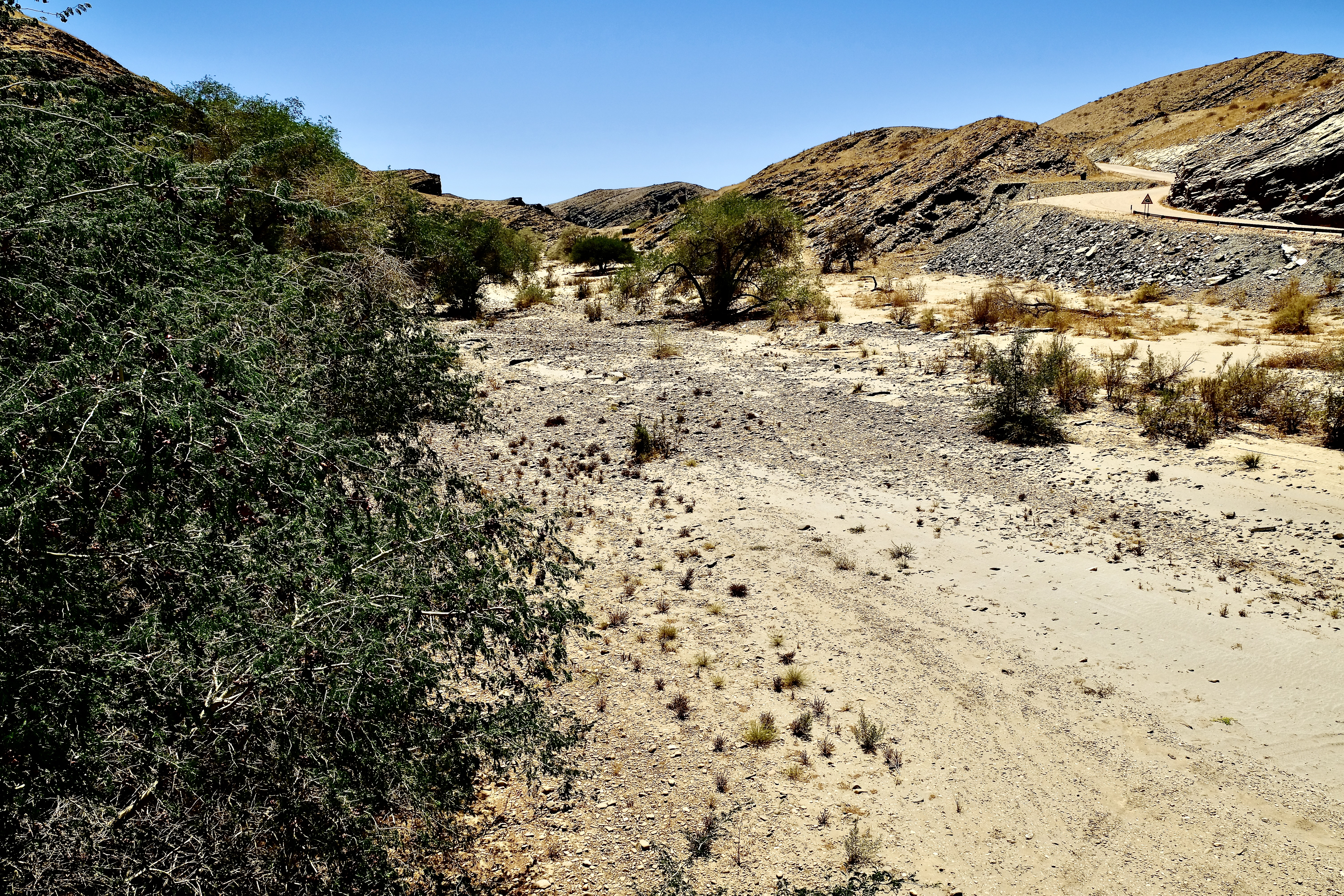 Zur Vegetation: Es wächst hier nicht viel. Aber man sieht immer wieder Kameldornbäume. Die Kameldornbäume sind findig und genügsam. Sie wachsen entlang der wenigen unter der Oberfläche befindlichen kleinen Wasserlinien und dringen mit bis zu 75 Meter tiefen Pfahlwurzeln zu ihnen vor. Überlebensfähigkeit ist in der Wüste alles.
