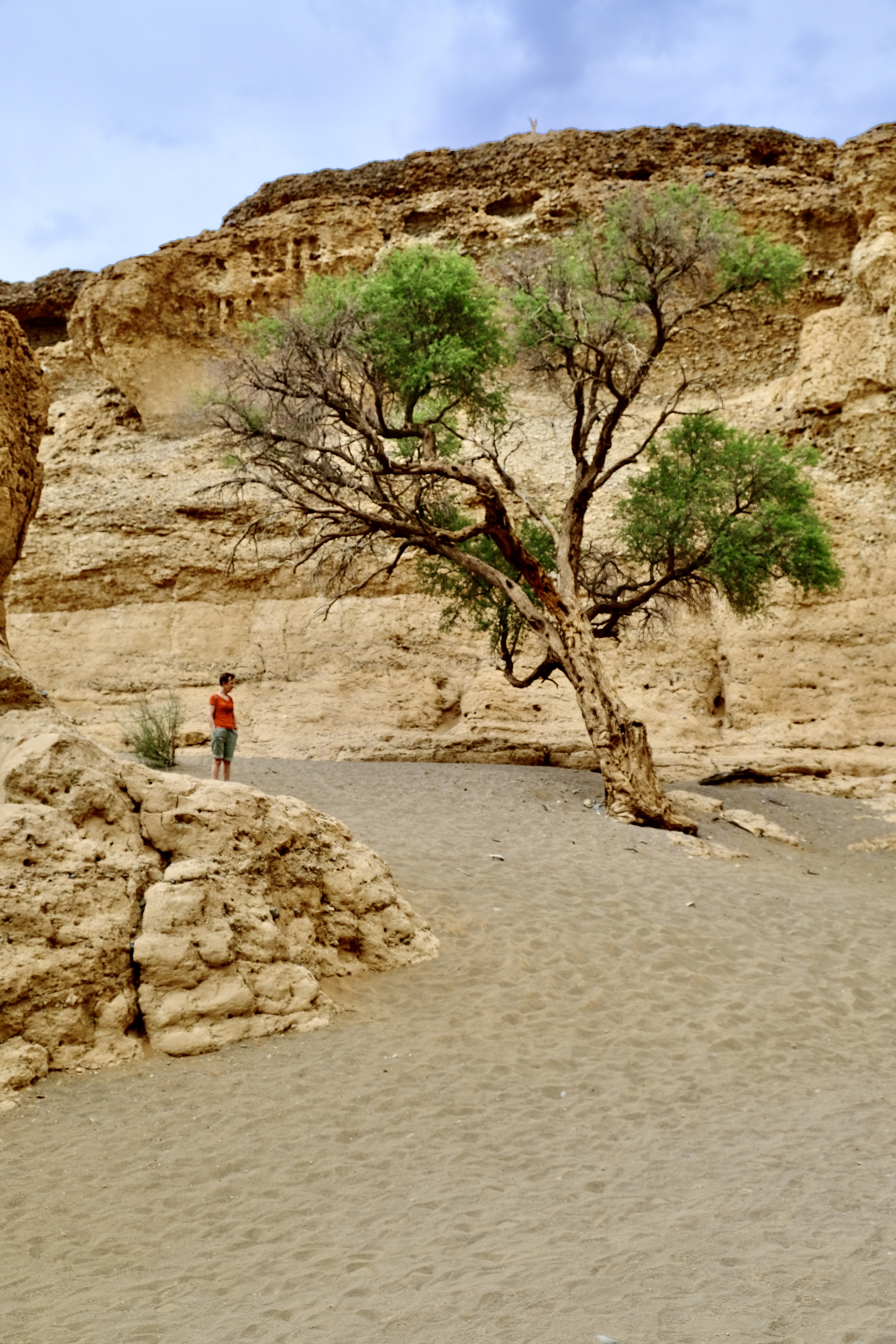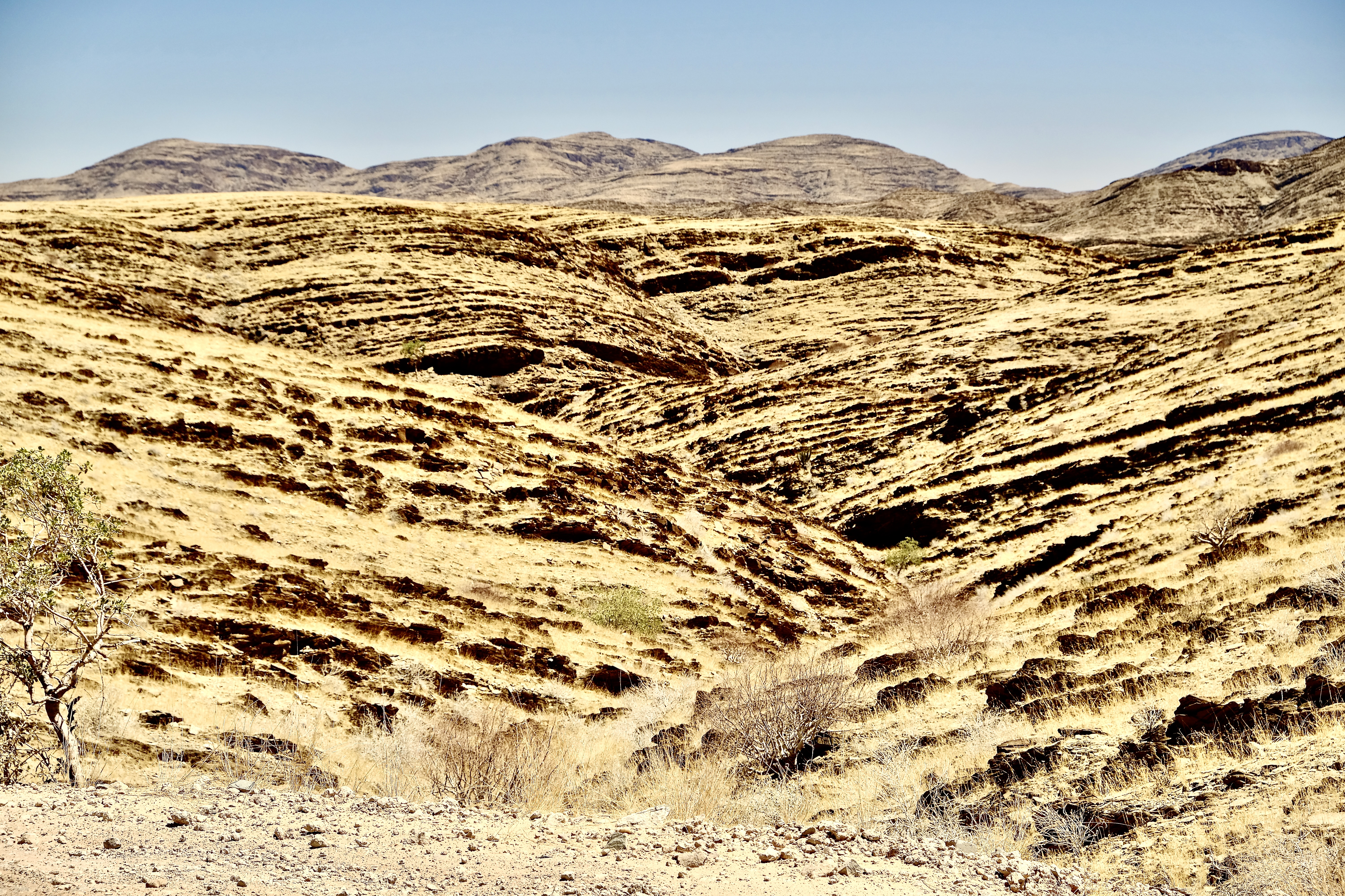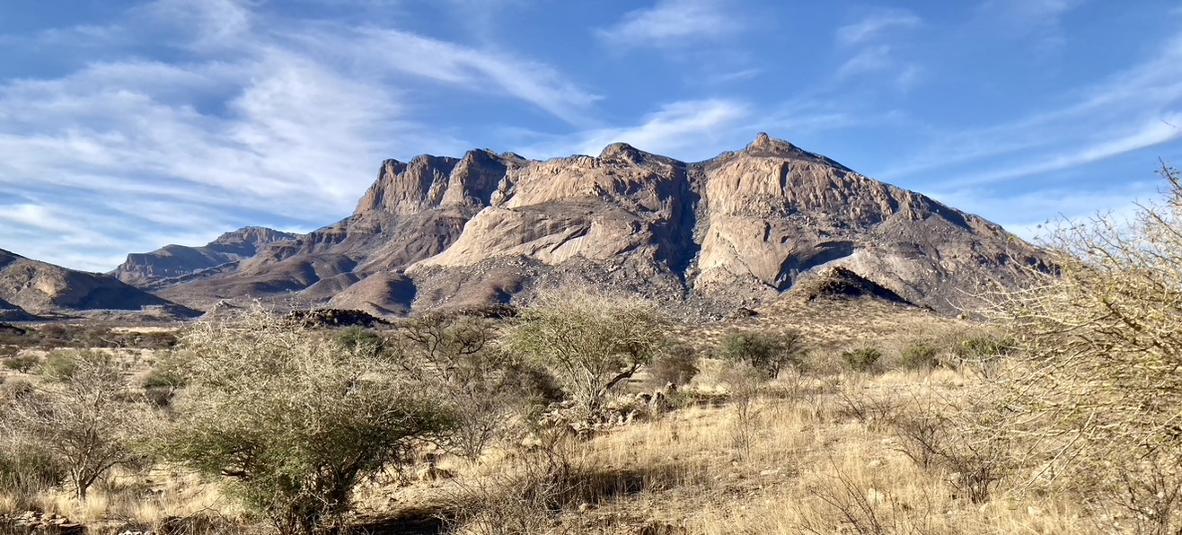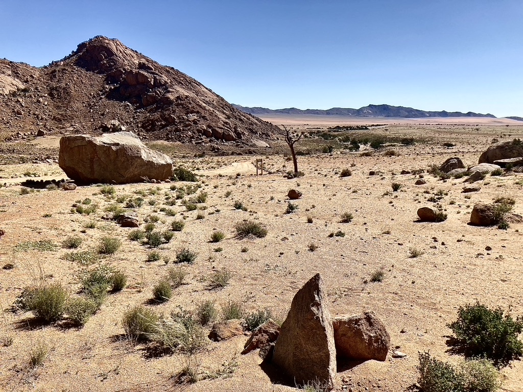 Zur Vegetation: Es wächst hier nicht viel. Aber man sieht immer wieder Kameldornbäume. Die Kameldornbäume sind findig und genügsam. Sie wachsen entlang der wenigen unter der Oberfläche befindlichen kleinen Wasserlinien und dringen mit bis zu 75 Meter tiefen Pfahlwurzeln zu ihnen vor. Überlebensfähigkeit ist in der Wüste alles.