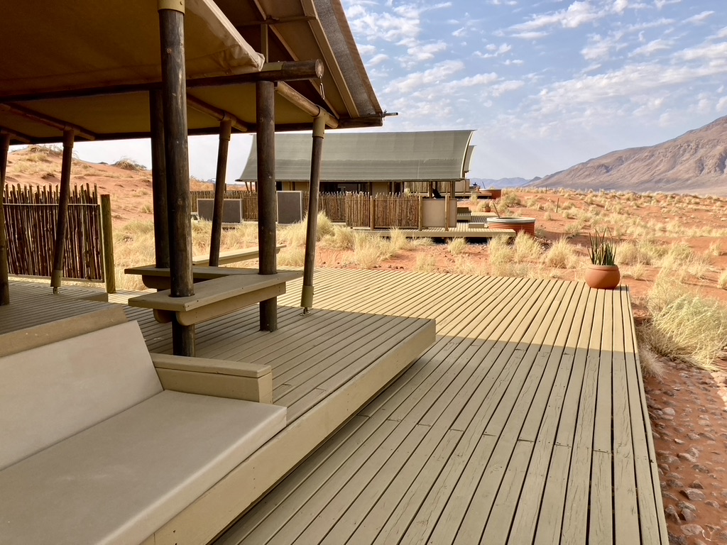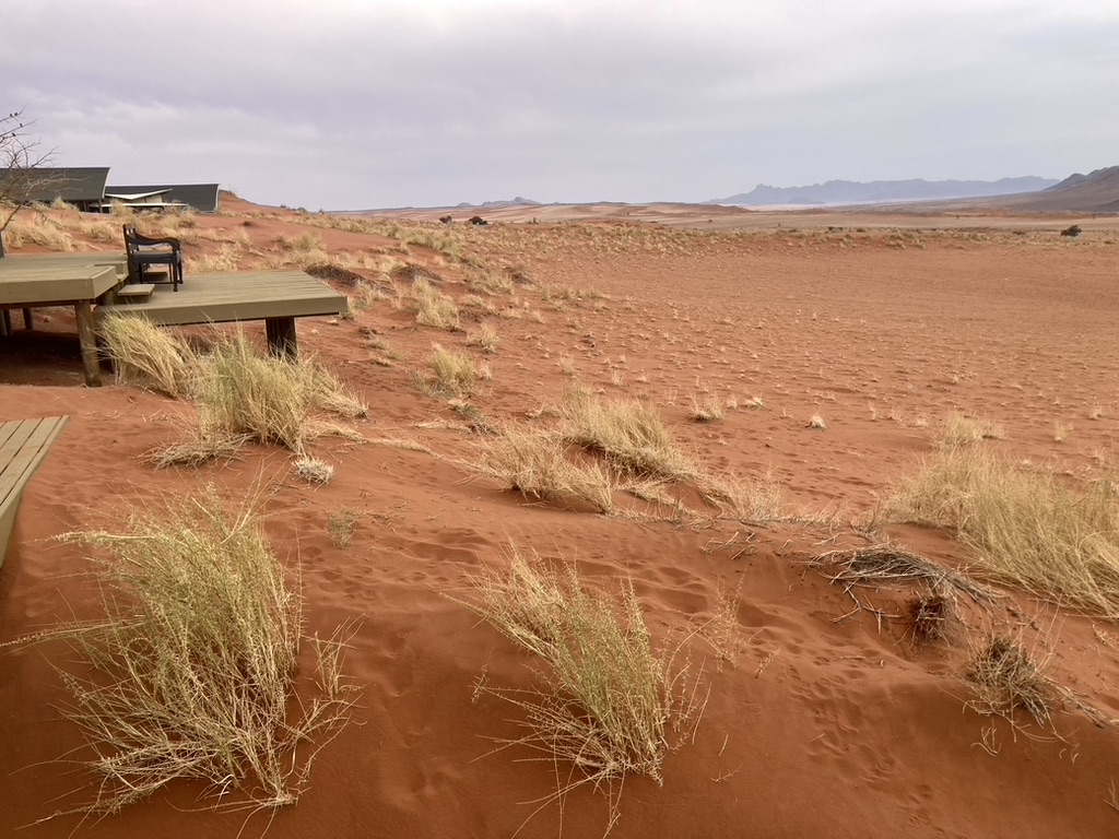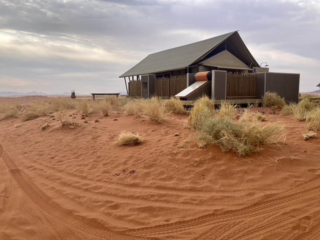 Diese Lodge ist auch ein guter Startpunkt um ein wenig „Wüsten-Feeling“ aufkommen zu lassen. Etwa 3 Kilometer vom alten Farmhaus am Eingang zur Lodge, auf einem Dünenhang, sitzt eine Reihe von Zelt/Holz-Hütten. Und in einer dieser Hütten schlafen wir.