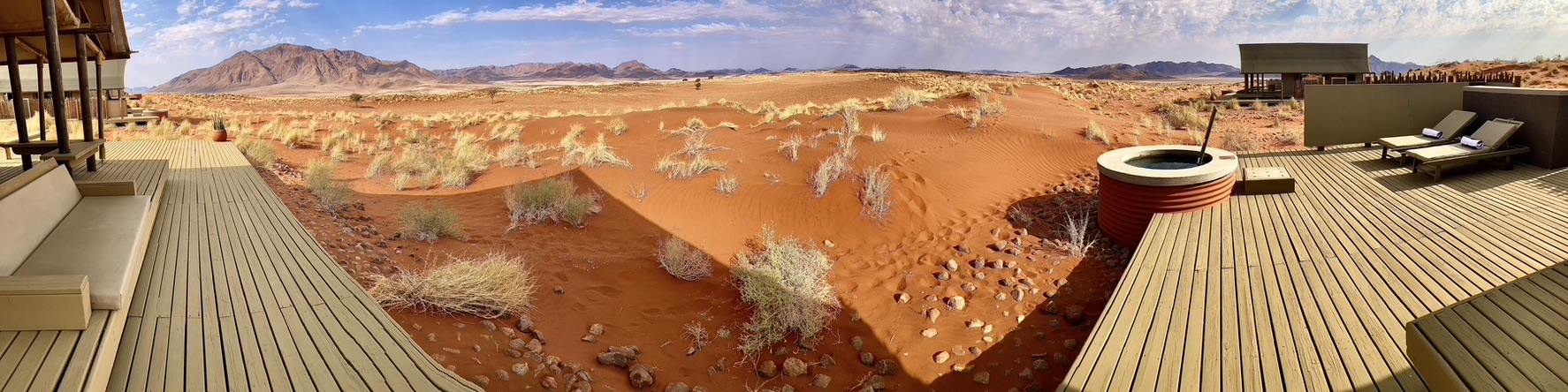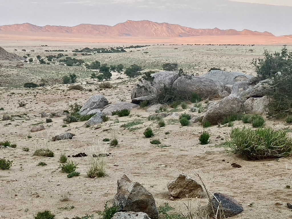 Maximal 16 Gäste werden hier untergebracht in 8 Hütten und einer Haupthütte für Frühstück und Abendessen. Der Blick von hier in die Landschaft ist fantastisch. Ringsum nur die Namib, Sand, einzelne karge Bäume und Sträucher und die hartgesottene Tierwelt, die hier überlebt. Abends fahren wir mit unserem Guide Philipp noch auf einen Sundowner auf einen Dünenkamm. Ein fantastischer Blick belohnt uns von hier oben.