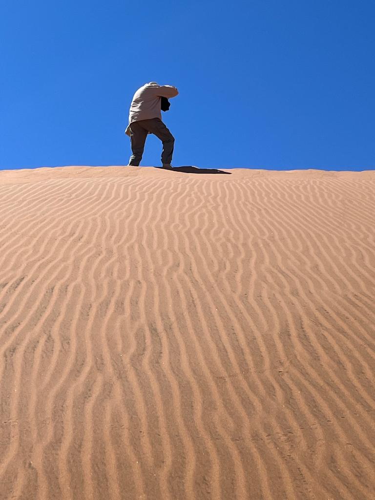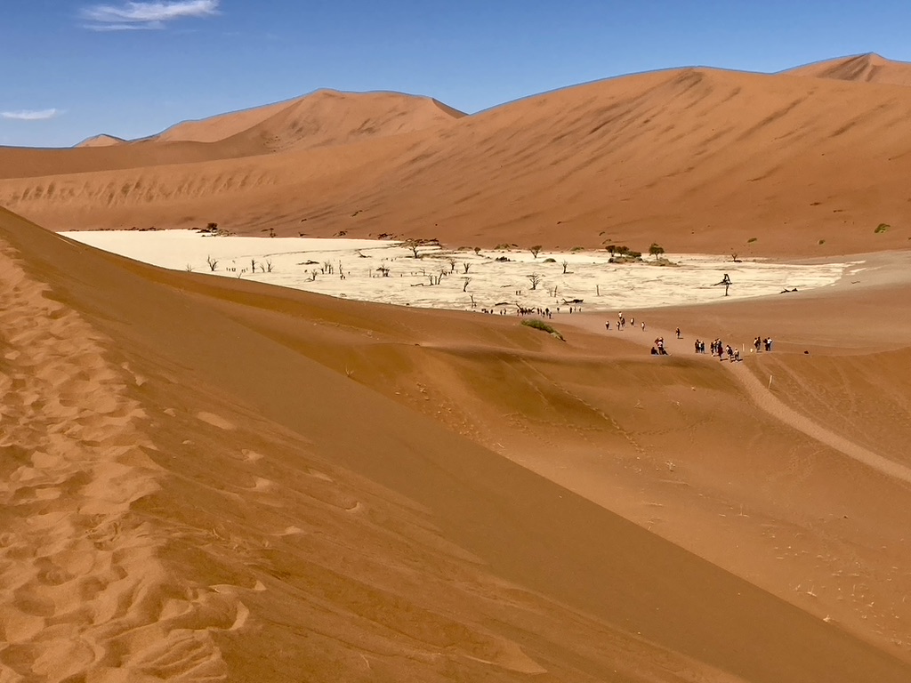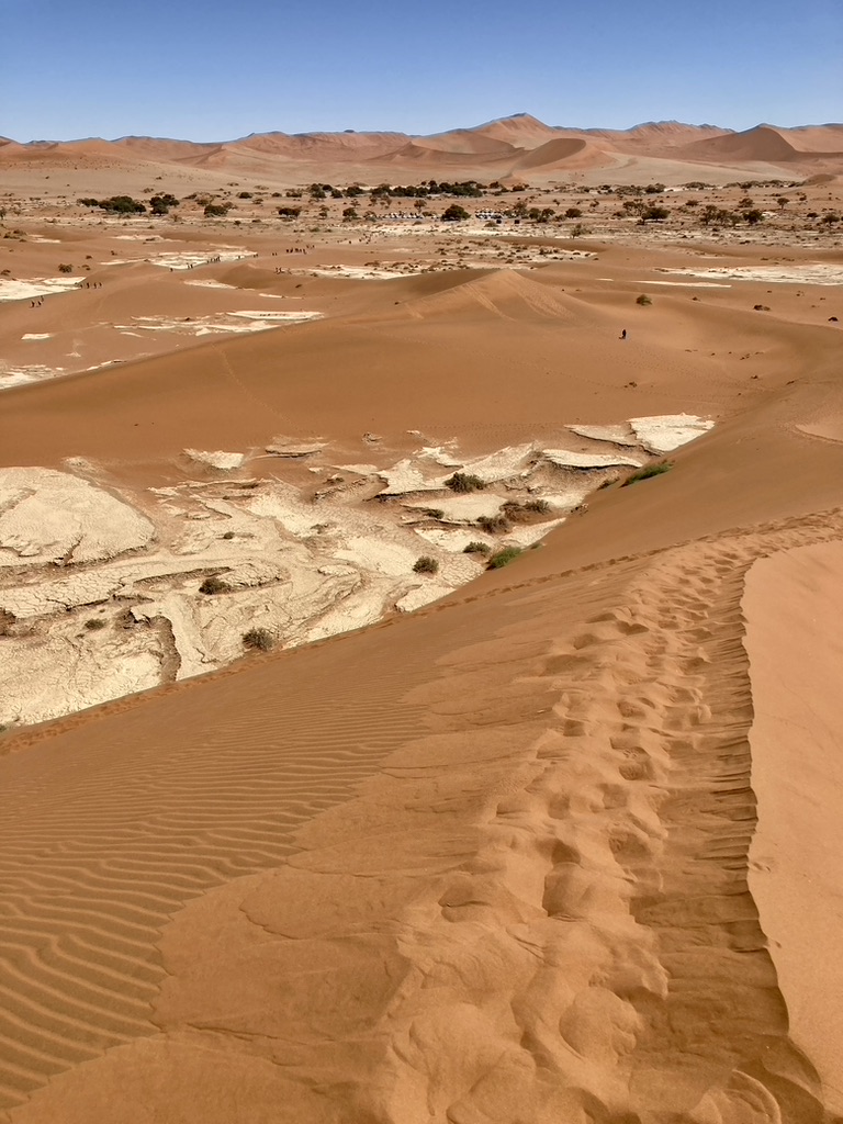 Der Aufstieg auf die Düne ist heftig. Es ist heiß und der Sand macht alles extra schwer. Die Dünen hier im Sossusvlei sind rund 5-8 Millionen Jahre alt und die meisten gelten in ihrem Kern als versteinert. Der spärliche Regen dringt in die Düne ein und verdichtet die Düne. Versteinert gewissermaßen. Und verrostet, oxydiert, daher die rote Farbe bei den besonders alten Dünen der Namib.