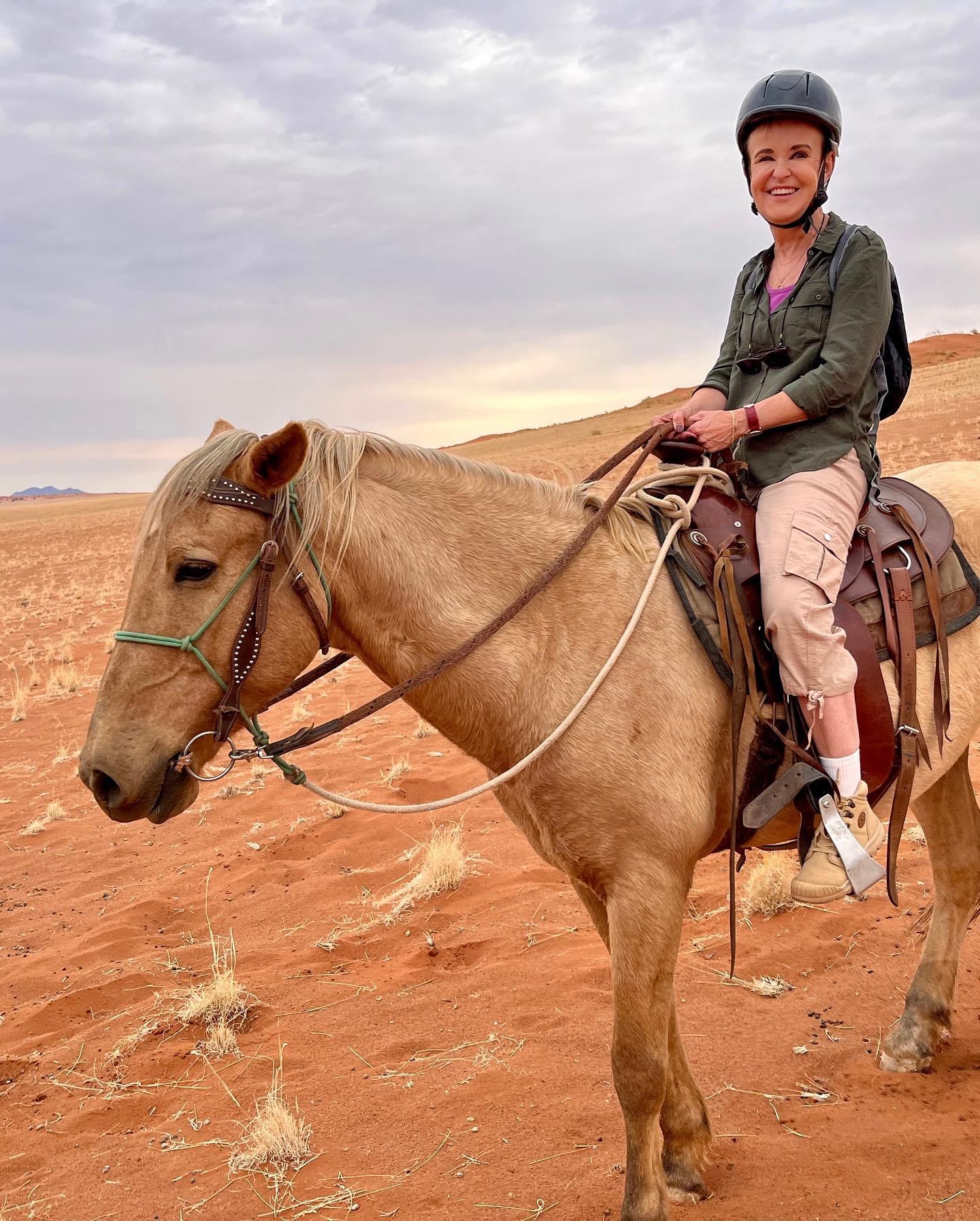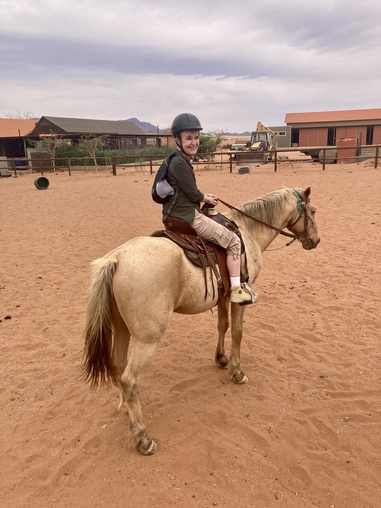 Mittags essen Edith und ich ein leichtes Lunch in der großen Haupthütte. Ein guter Salat, gutes Brot mit Butter und weisses Mouse mit einer Fruchtsauce, dazu ein kühles Bier. Das ist schon reichlich bizarr hier am Dünenkamm. Aber ein einzigartiges Erlebnis. Am späteren Nachmittag Reiten wir. Na ja, wir sitzen auf braven Pferden, die hinter dem Guide auf seinem Pferd hergehen. Aber es macht Spaß. Edith sitzt auf Lucky, ich sitze auf Yonda.