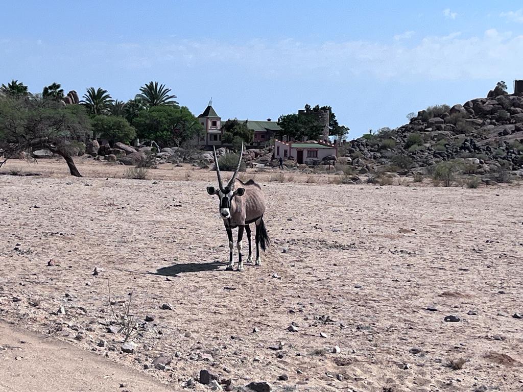 Morgens gibt es eine nette Überraschung. Als ich einen Vorhang vom Fenster zur Seite ziehe, sieht mich aus vielleicht 10 Meter Entfernung eine Antilope an. Sie ist genauso überrascht wie ich, trottet aber ganz entspannt weg von unserer Hütte und ehe ich den Fotoapparat holen kann, ist sie auch schon oben auf dem Dünenkamm und zu weit entfernt.