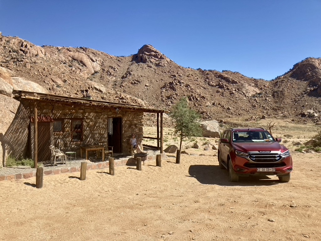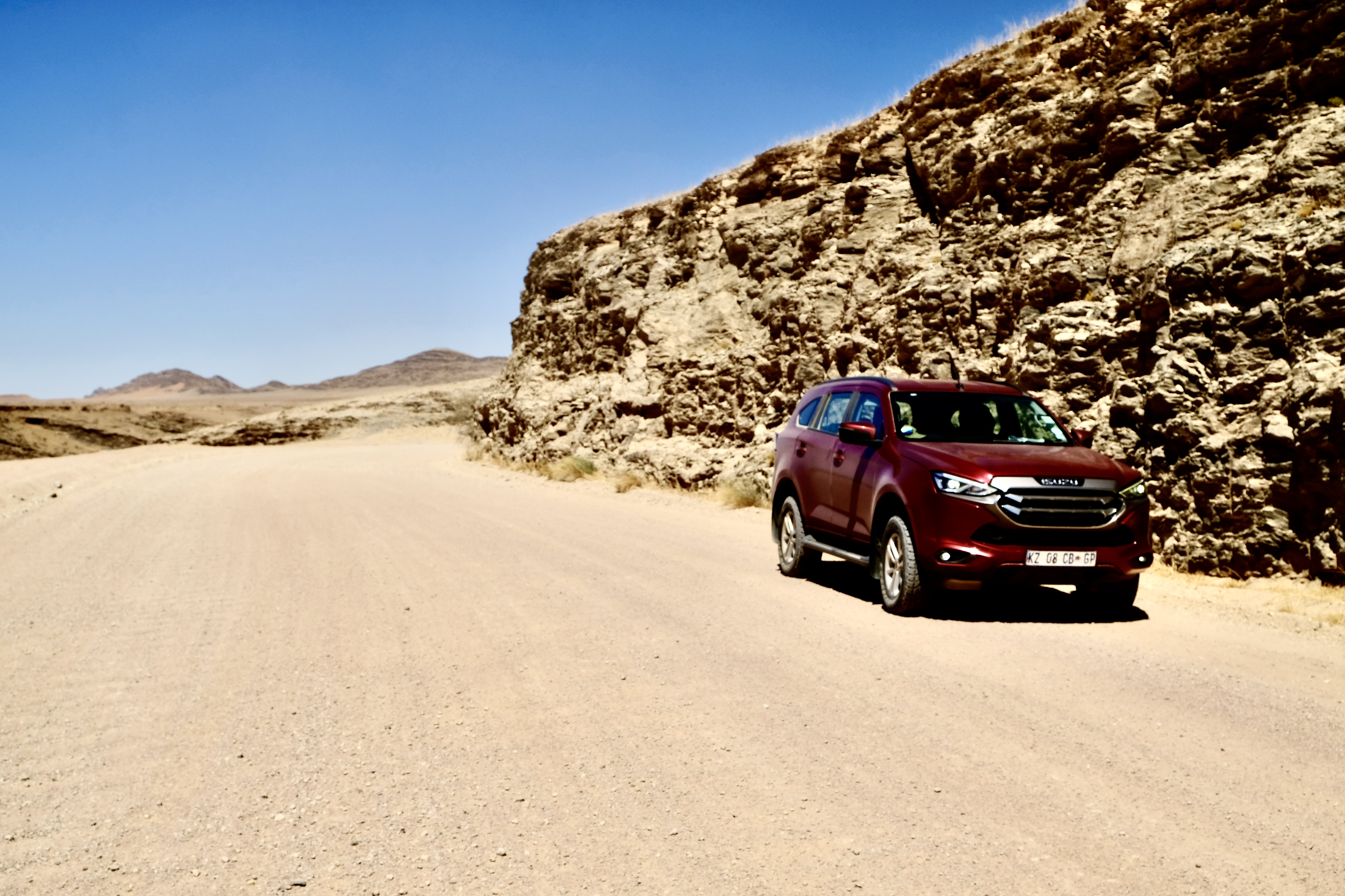 Vormittags gegen 10 Uhr sind wir endlich in Windhoek aus dem Flughafenterminal und beim Autoverleiher. Wir haben uns einen robusten 4X4 bestellt. Von der letzten Reise in diese Region ist uns noch der Toyota Hilux in allerbester Erinnerung. Robust, bequem, einfach zu fahren und sehr geländegängig, auch wenn man es nur eher selten braucht. Jedenfalls im Norden. Hier im Süden sind wir vorgewarnt worden, braucht man den 4×4 öfter. Es gibt mehr Sand, noch deutlich mehr Schotter und dann ist es gut ein widerstandsfähiges Allradfahrzeug zu haben. Unser Verleiher hat für uns einen Isuzu Mu-X bereitgestellt. Im ersten Moment waren wir etwas überrascht. Wir kannten das Auto noch nicht, hatten nicht davon gehört. Aber wir haben ihm vertraut, als er uns sagte, wir würden nicht enttäuscht werden, der Isuzu sei besser als der Toyota Hilux und der Toyota Fortuner. Und er sollte recht behalten.er Isuzu ist wirklich ein super 4×4 Fahrzeug für alle Gelegenheiten. Und er sah für uns gar nicht so aus, was bestimmt an seiner roten Lackierung lag.