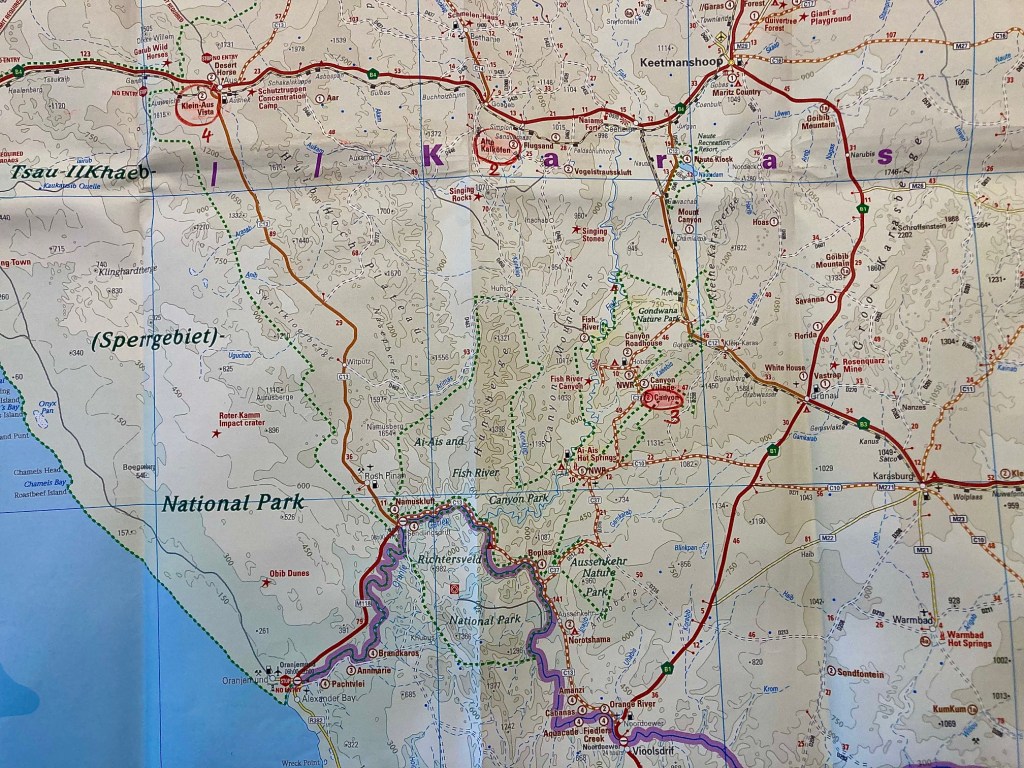Unsere nächste Tagesetappe führt uns vom Fish River Canyon nach Aus, nordwestlich von hier und rund 110km östlich von Lüderitz. Es gibt zwei Routen nach Aus von hier. Eine Route erst nach Südwesten an die Grenze nach Südafrika und dann über Rosh Pinan auf der C13 nach Norden und eine Route zurück über die C12 Richtung Keetmanshoop und dann auf der B4 nach Westen. Die südwestliche Route wird im Führer als schön, aber gelegentlich unpassierbar oder jedenfalls schwierig beschrieben. deshalb frage ich unseren Ranger nach dieser Route und er sagt, „er hat schon mal von einem gehört, der diese Route genommen hat“. 🙂 Das ist uns dann doch zu seltsam und unsicher und wir beschließen unseren Hobby-Abenteurer-Elan wieder einzupacken und die C12 / B4 zu fahren.