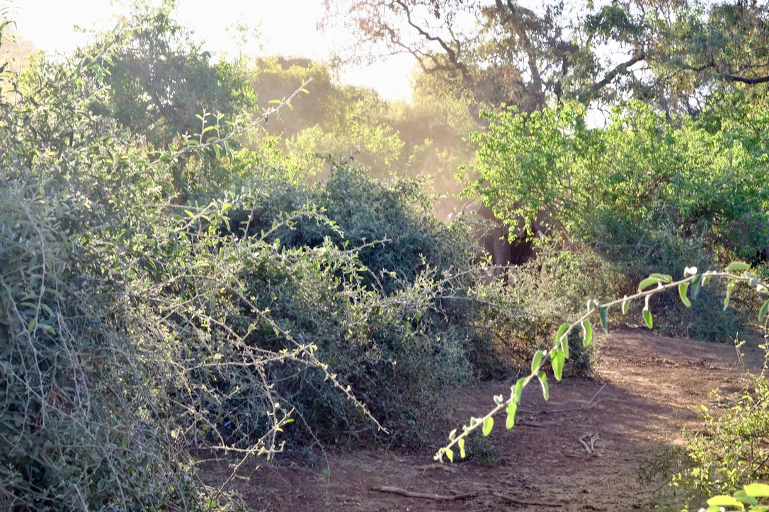 Dennoch haben wir einen interessanten Nachmittag und Abend mit ihm. Als wir unten am Flussufer entlang fahren, ist Cameron mit unserem Landcruiser im Gebüsch recht schnell unterwegs und schreckt einen kleineren Elefanten auf, der laut trötend davon eilt. Das wiederum bringt den Elefantenbullen auf den Plan. Er stellt die Ohren auf, brülllt und läuft auf uns zu. Da hilft nur noch im Rückwärtsgang so schnell es geht Abstand gewinnen und uns alle in Sicherheit bringen. Trotz zweimaliger neuer Versuche führt kein Weg mehr am Bullen vorbei. Er bewacht seine Herde und lässt uns nicht aus den Augen. Also kehren wir um und wählen einen anderen Weg. Leider ging das ganze so schnell und wir waren so mit uns beschäftigt, dass ich nur zwei schnelle Bilder mit dem Handy machen konnte.