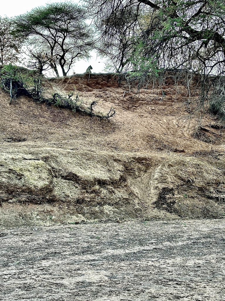 Joe fährt auf geradem Weg ins trockene Flussbett. Und wir haben gleich Glück. Am gegenüberliegenden Ufer liegt eine Löwin. Ganz oben auf der Böschung. Sie lauert und herrscht selbstbewusst über das Territorium. Irgendwann fängt sie an zu brüllen. Noch nie haben wir eine Löwin in freier Wildbahn so laut und heftig brüllen gehört. Es ist beeindruckend. Auf ihrer Speisekarte möchte man nicht stehen. Dann kommt eine zweite Löwin dazu