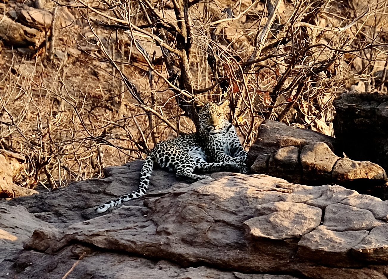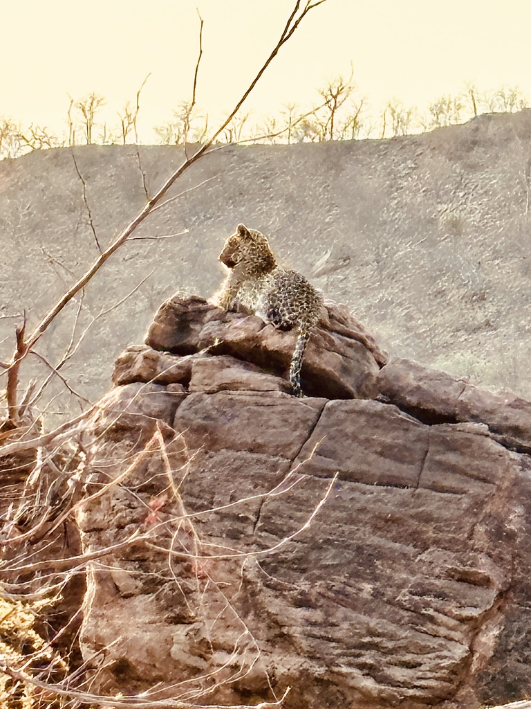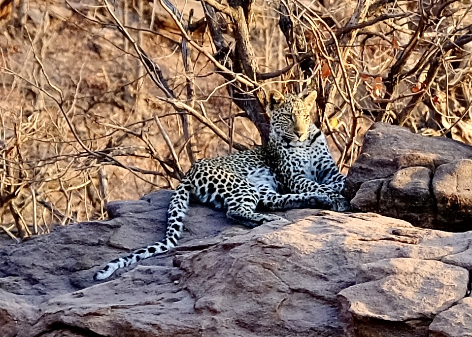 Joe kennt hier jeden Stein und jedes Tier. Er weiß auch, wo sich die Leoparden am liebsten aufhalten und findet auf Anhieb erst 2 und dann nochmals 2 Leoparden. Die Leoparden liegen auf und hinter Felsen. Joe sieht sie auf Entfernungen, bei denen wir erst noch dreimal nachfragen müssen, ehe wir dann unter seiner Leitung ebenfalls die Leoparden entdecken. Langsam fährt er an die Tiere heran, stellt den Motor ab und wir schauen ihnen einfach zu.