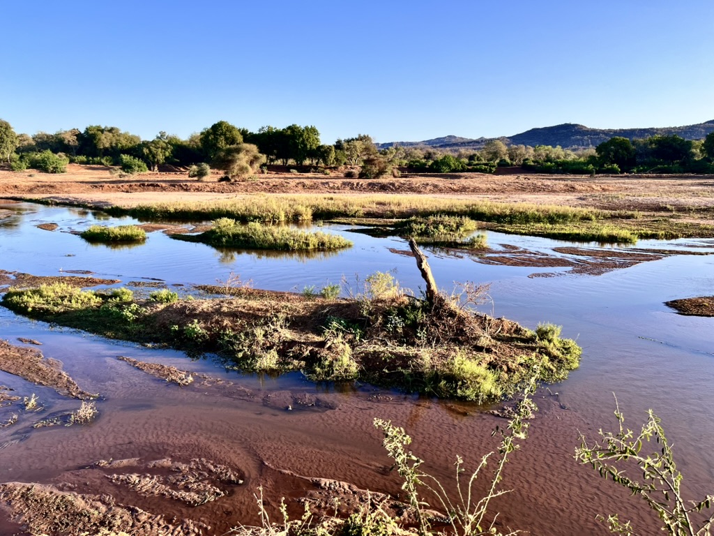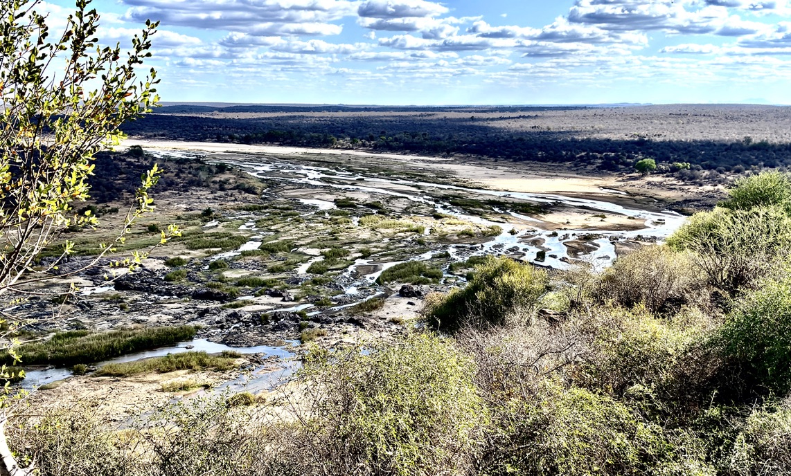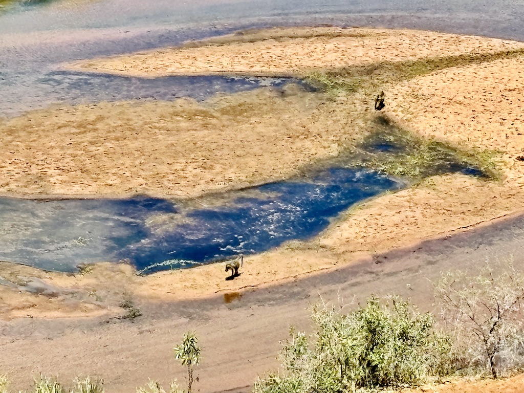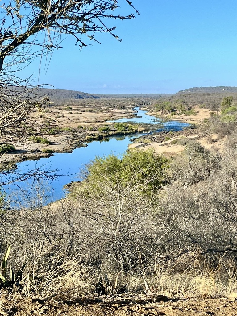 Der Fluss unten hat kaum Wasser. Es ist Trockenzeit nach dem Winter (unserem Sommer) in Afrika. Im Frühjahr und Sommer steigt der Fluss, der Luvuvhu, wieder an. Man kann das gut an der Flusslandschaft erkennen. Die ganze Natur wird dann völlig anders sein.