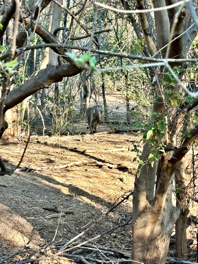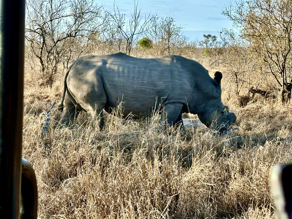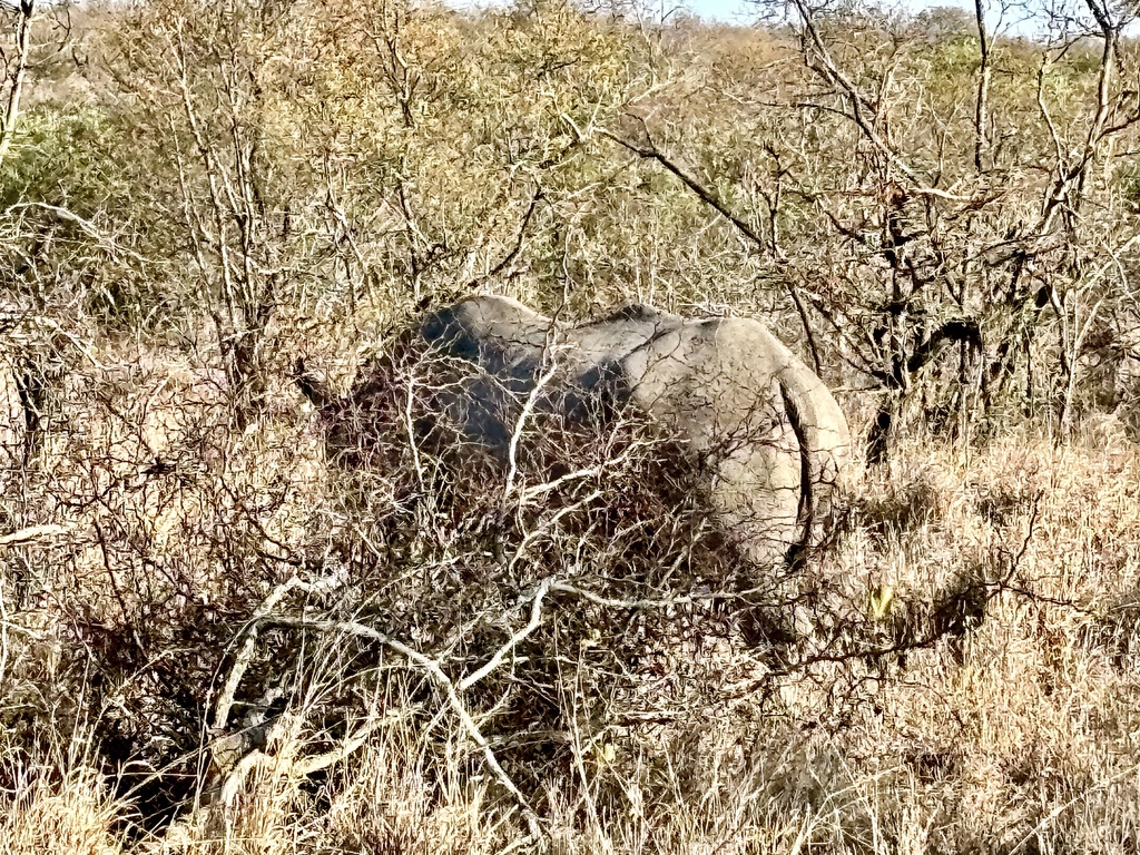 Unterwegs sehen wir auch ein großes Nashorn, ohne Horn. Ein wirklich großes und schweres Tier. Die Hörner werden häufig von den Rangern entfernt, um sie unattraktiver für Wilderer zu machen. Der Ranger sagt, dass die Entfernung des Horns keine sehr große Auswirkung auf das Verhalten des Tieres hat. Das Nashorn kann sein Rudel immer noch verteidigen und Nashörner haben nur als Junges Feinde. Aber für den Kampf zwischen den Bullen ist ein Nashorn ohne Horn gegenüber einem Nashorn mit Horn im kleinen Nachteil. Auch Nashörner haben Egos.
