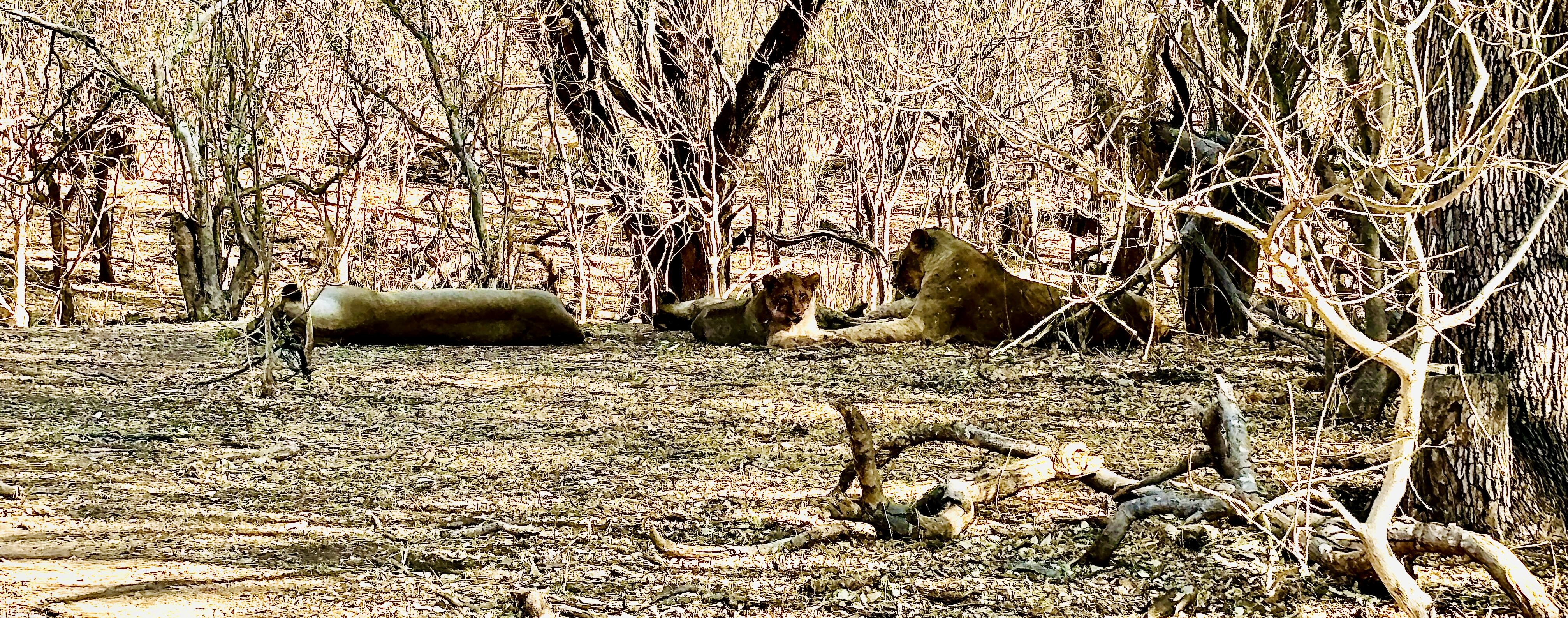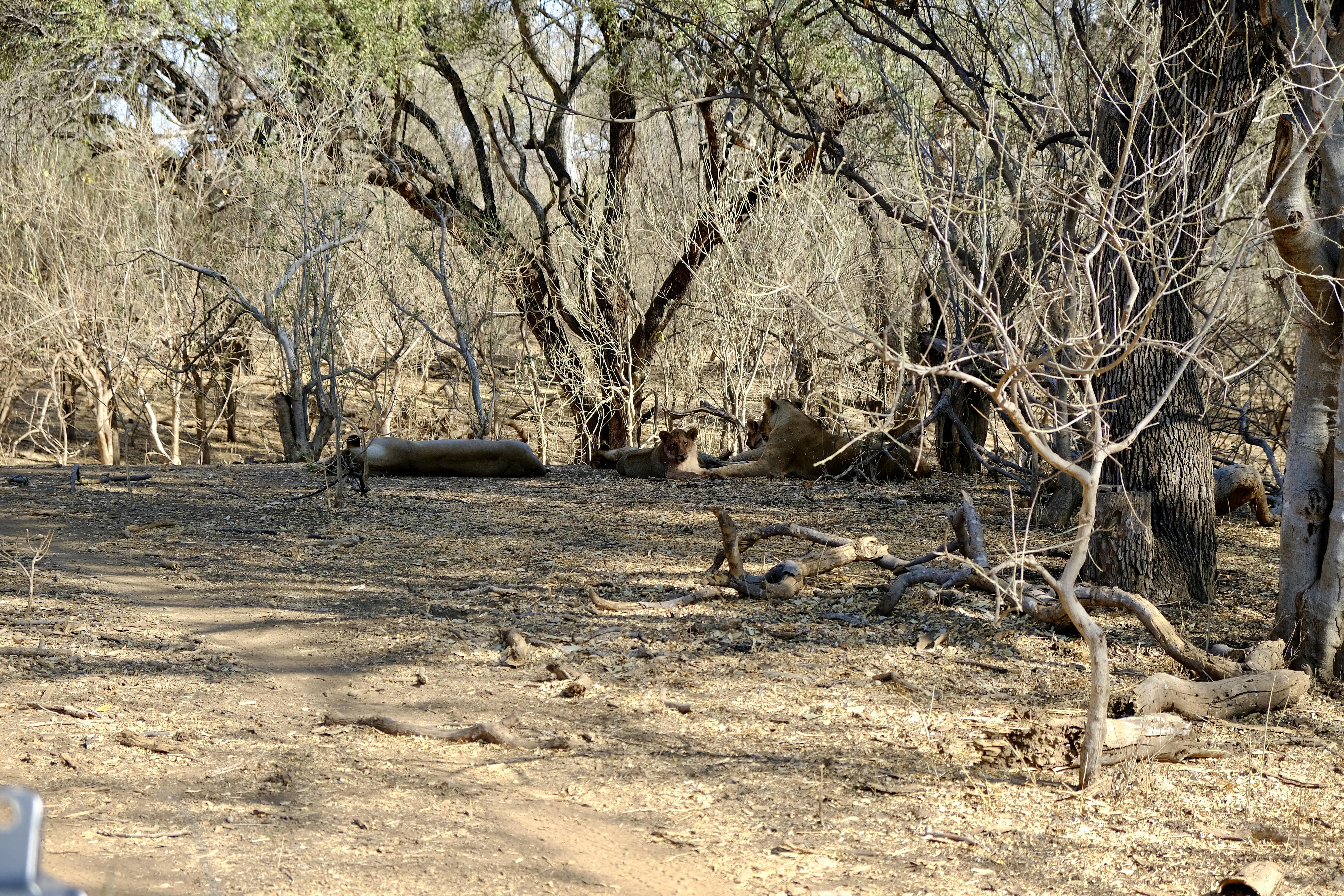 Mitten im Dickicht sehen wir dann ganz unverhofft ein kleines Rudel Löwen. Scheinbar friedlich dösen sie vor sich hin. Ohne unseren Guide möchte man hier nicht unterwegs sein. Man sieht die Löwen oft erst so spät, dass man schon fast bei ihnen ist ehe man sie bemerkt. Umgekehrt ist das sicher anders.