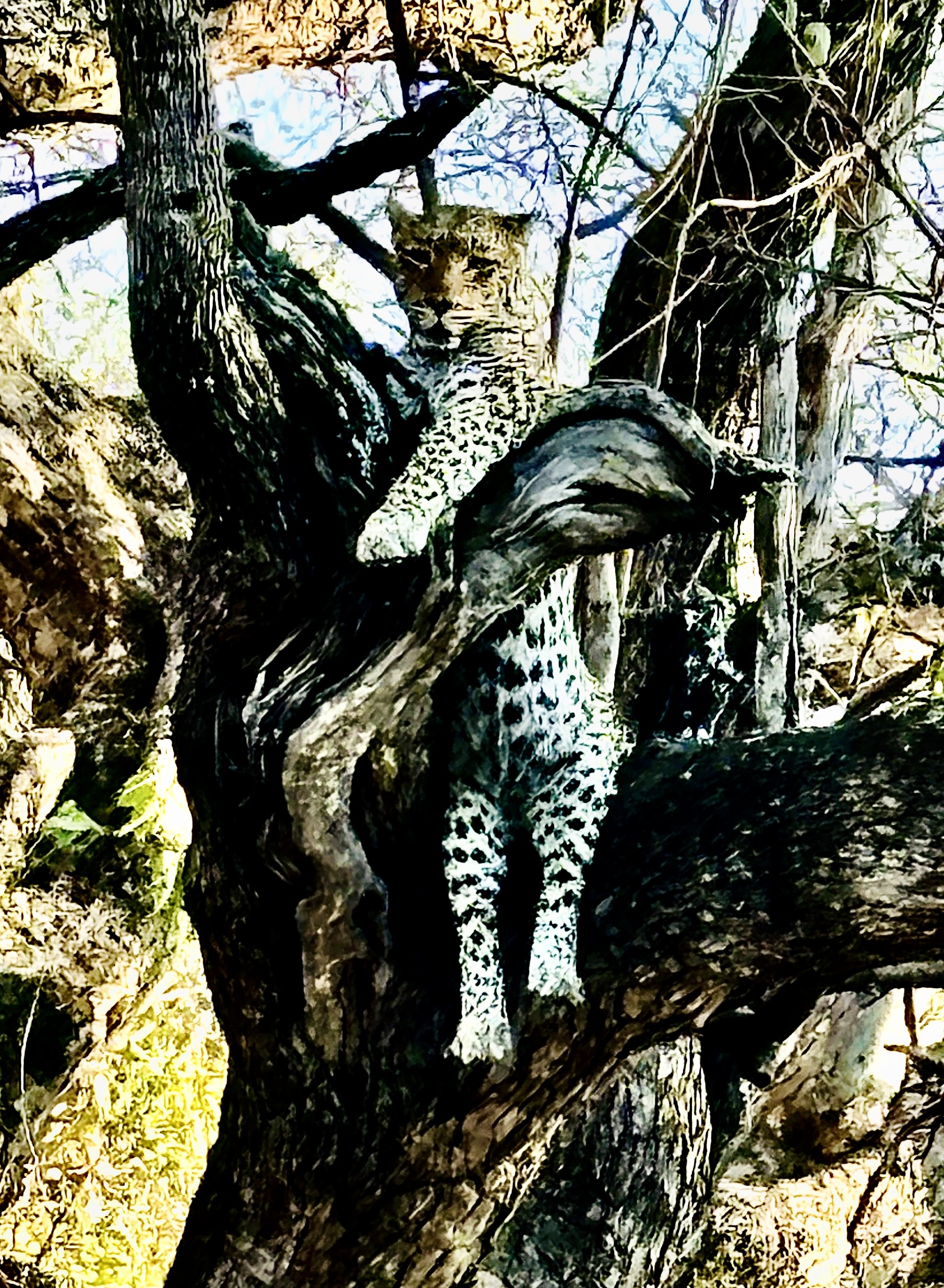 Wir verlassen das Flussbett und folgen der Spur der Löwin am Ufer. Sie bleibt aber verschwunden. Dafür findet Joe einen Leoparden, der oben in einem Baum auf einem Ast liegt. Wie eine große Katze. Fast könnte man glauben, man könnte ihn kuscheln. Übrigens würden Löwen auch Leoparden nicht verschmähen, sagt Joe. Wenn sie einen erwischen. Löwen fressen alles was gefressen werden kann.