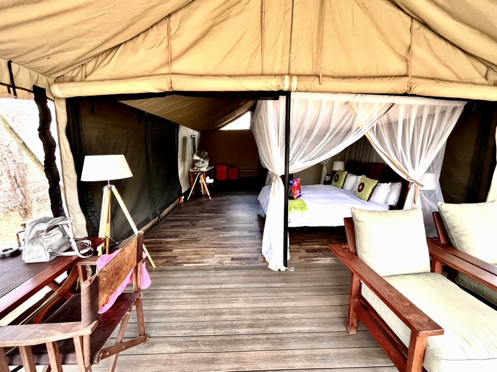 Das Serolo Camp gefällt uns gut. Wir haben eine feste Hütte gleich in der Nähe des Haupthauses. Es gibt genug Platz und einen Deckenventilator, der die warme Luft umherwirbelt. Das kühlt zumindest ein wenig.