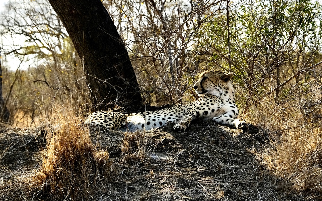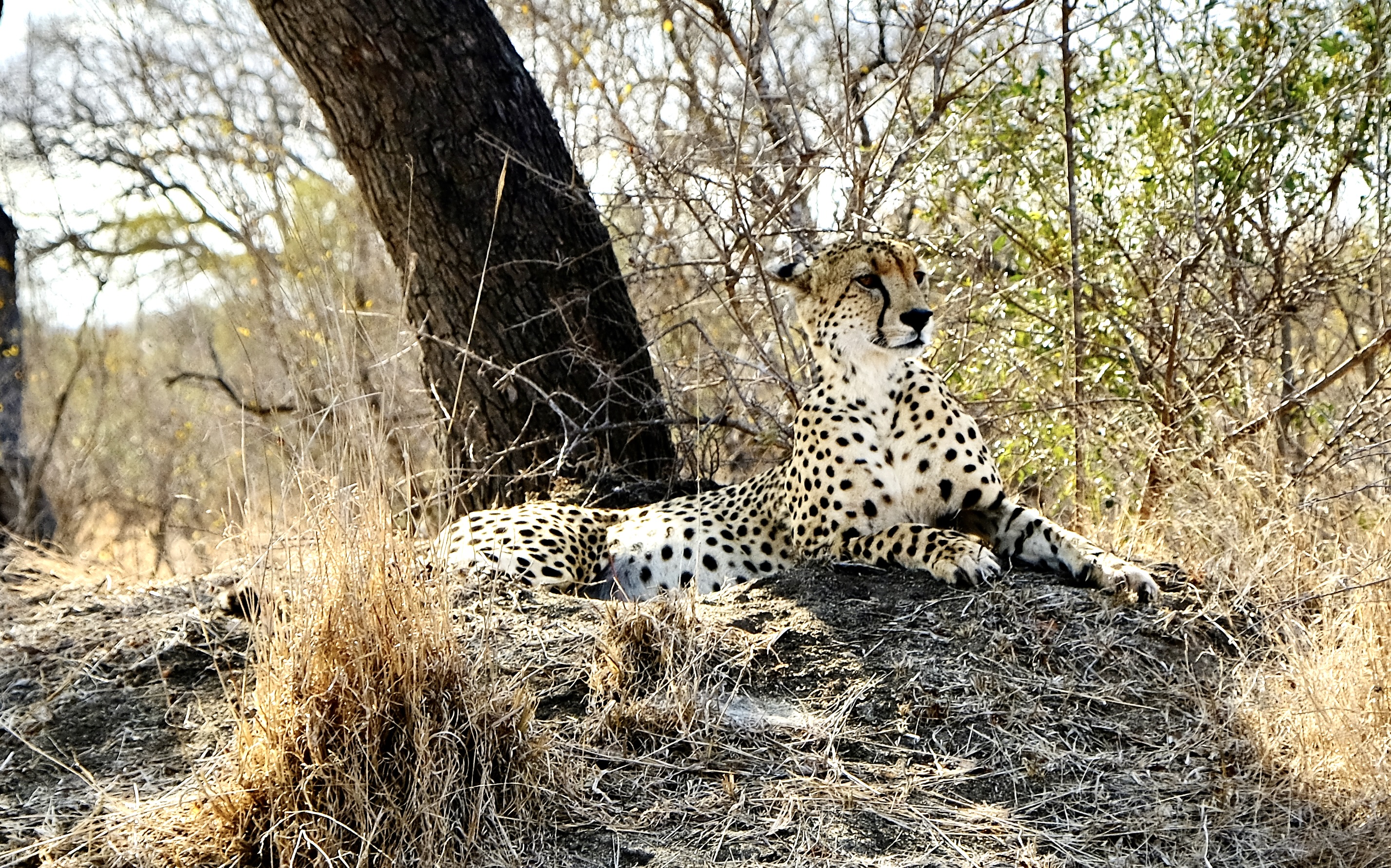 Am nächsten Morgen um 5:20 Uhr heißt es Aufstehen. Kleine Wäsche, dann warm anziehen. Inklusive Wintermütze und Handschuhe. Um 6 Uhr beginnt der Morgen-Drive. Es ist wie im Winter. Alle sind eingemümmelt. Die kalte Savanne ruft. Wir fahren wieder nach Süden. Nach einer dreiviertel Stunde finden die Ranger einen einzelnen Geparden. Er liegt zunächst im Gras, man sieht ihn kaum, steht dann irgendwann auf und geht langsam seines Weges. Es ist immer wieder schön, einem Tier so nahe zu sein. Ohne Gitter, ohne Zaun, ganz direkt.