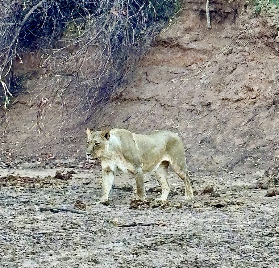 Nach einer Weile kommt die zweite Löwin den Abhang herunter auf uns zu. Sie geht im Abstand von einigen Metern an uns vorbei und würdigt uns keines Blickes. Wir sind sehr still und verfolgen sie mit unseren Blicken. Wir sitzen immerhin im offenen Geländewagen. Keine Tür, kein Fenster, nichts würde die Löwin abhalten, sollte sie sich entschließen uns mal zu testen. Man weiß ja nie. Die Löwin durchquert das Flussbett ganz gelassen und verschwindet dann am anderen Ufer im Dickicht.