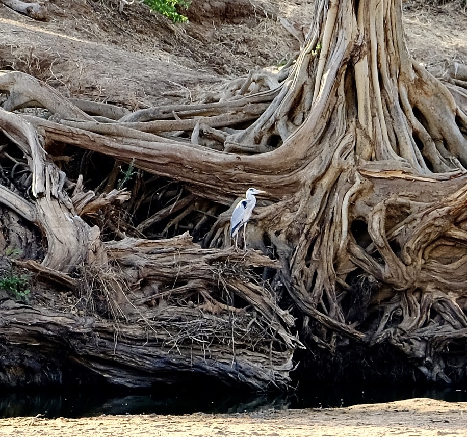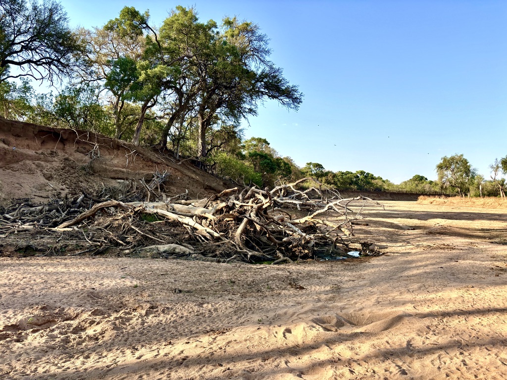 Freitag. 5 Uhr aufstehen. Um 5:20 Uhr ist unser Morning Drive mit Joe angesagt. Wir wollen runter zum Limpopo. Der Fluss ist staubtrocken. Ein paar kleinere Resttümpel zeugen davon, dass hier vor Monaten ein großer Strom geflossen ist und in einigen Wochen wieder fließen wird. Es ist gerade schwer vorstellbar. Nur die hohen Uferböschungen und die angeschwemmten Bäume zeugen davon. Auch die freigelegten Wurzeln der Büsche und Bäume, die am Ufer wachsen und dann von den Wassermassen jedes Jahr zur Regenzeit weiter ausgespült werden.