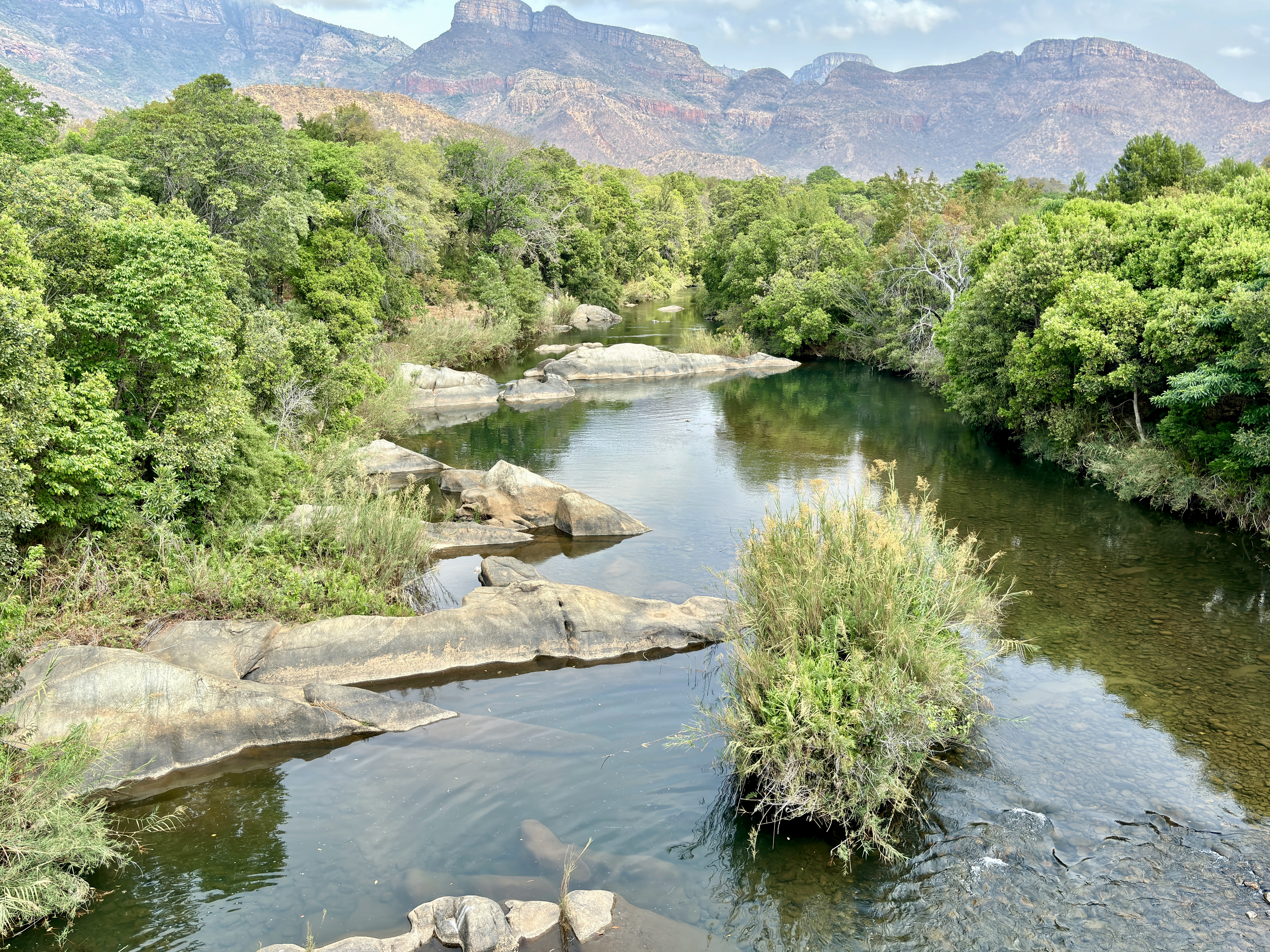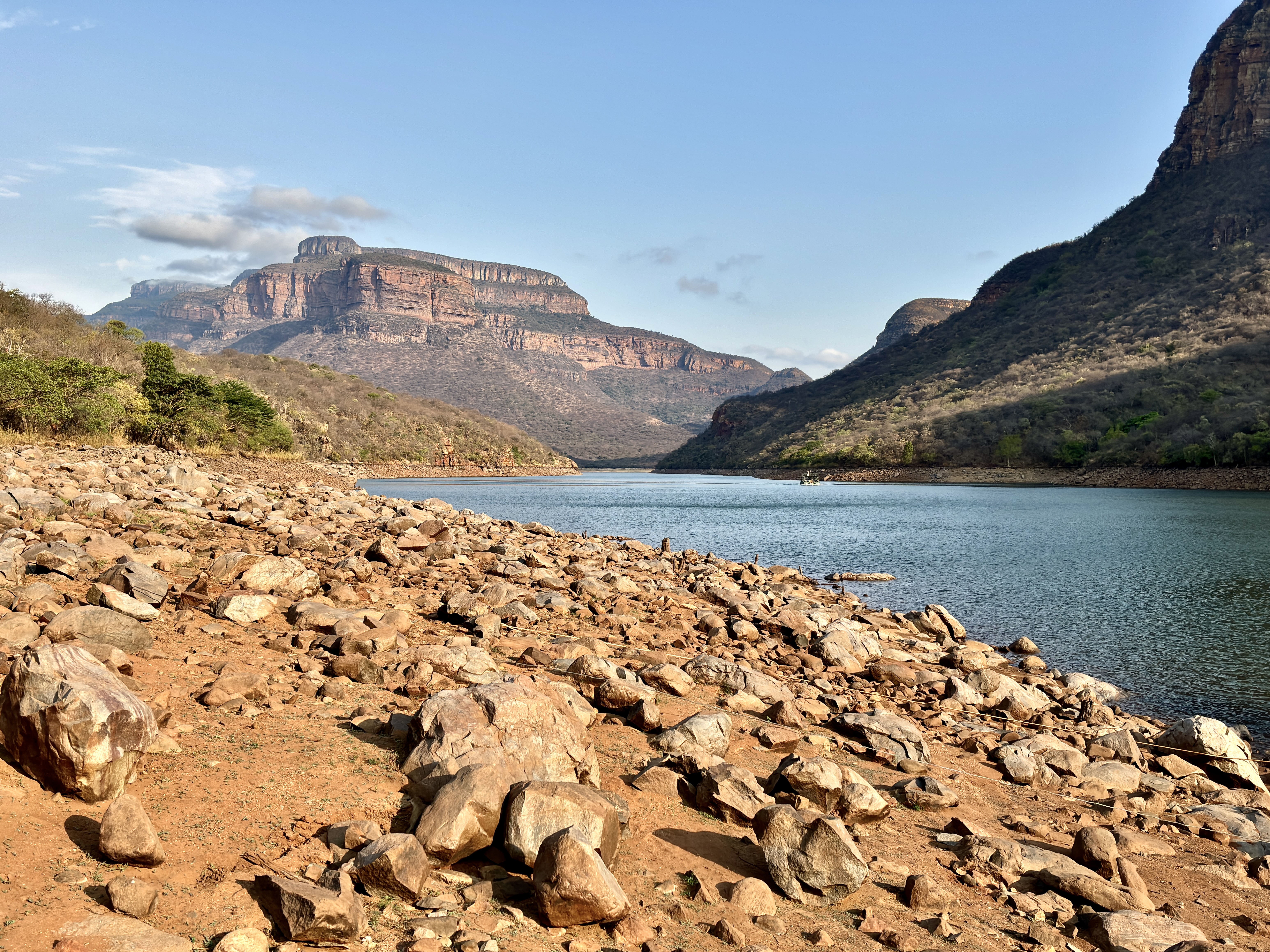 Am nächsten Morgen machen wir uns auf den Weg weiter nach Nord-Osten zum Blyde River Canyon, kurz vor dem Orpen Gate, dem Eingang zum Krüger Park. Dort bleiben wir 2 Nächte in der Blyde River Canyon Lodge. Der Blyde River Canyon ist ein 26 km langer bis zu 800 m tiefer und hauptsächlich aus rotem Sandstein bestehender Canyon. Er zählt zu den großen Naturwundern Afrikas. Die Landschaft erinnert uns teils an den Lake Powell in den USA. Lake Powell in klein gewissermaßen. Auch hier staut ein Damm den Fluss, den Blyde River, auf und erzeugt einen sehr eindrucksvollen Stausee in dieser bizarren Landschaft.